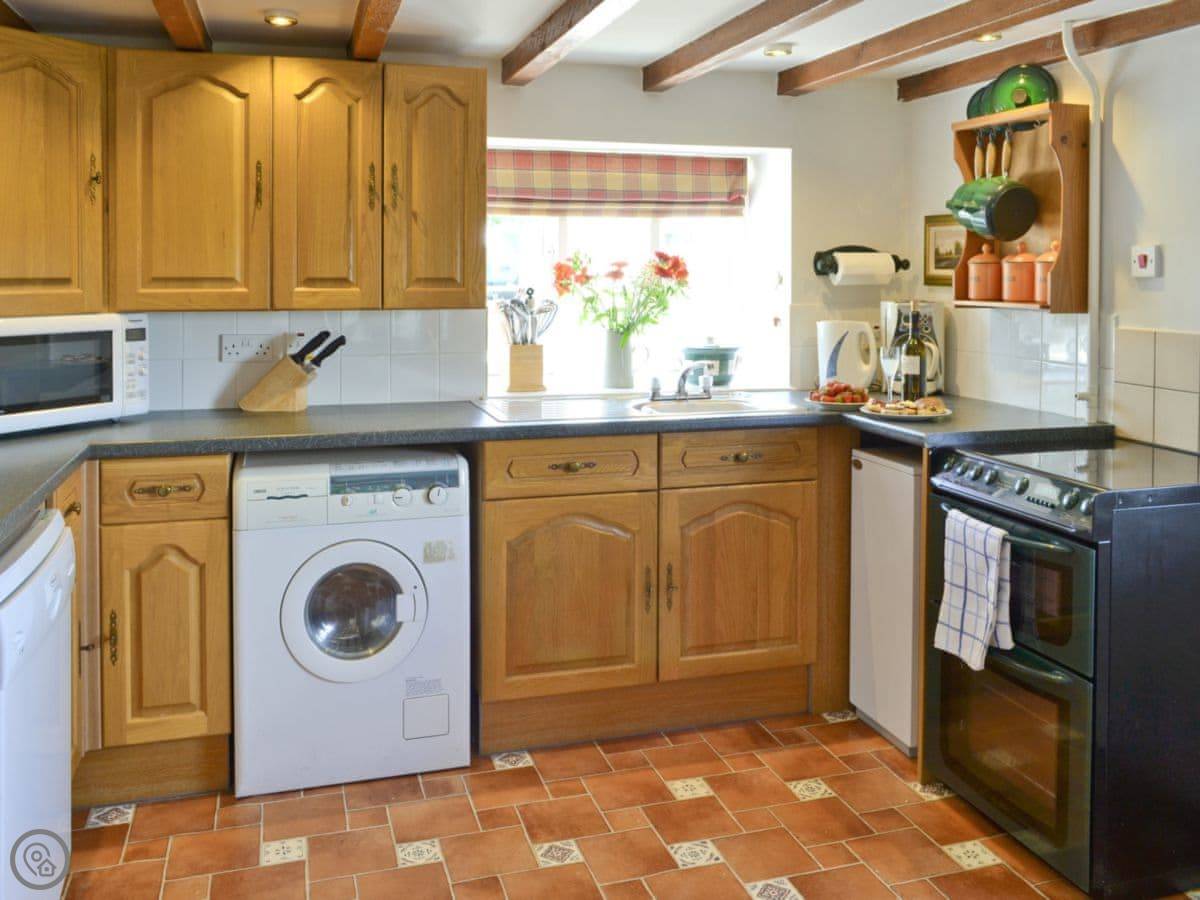 Inside the house, you've got a washing machine, a dishwasher, and a wood burning stove. Bedding and towels are included. There's a cot and a highchair if you need them. The entrance is wheelchair accessible.
