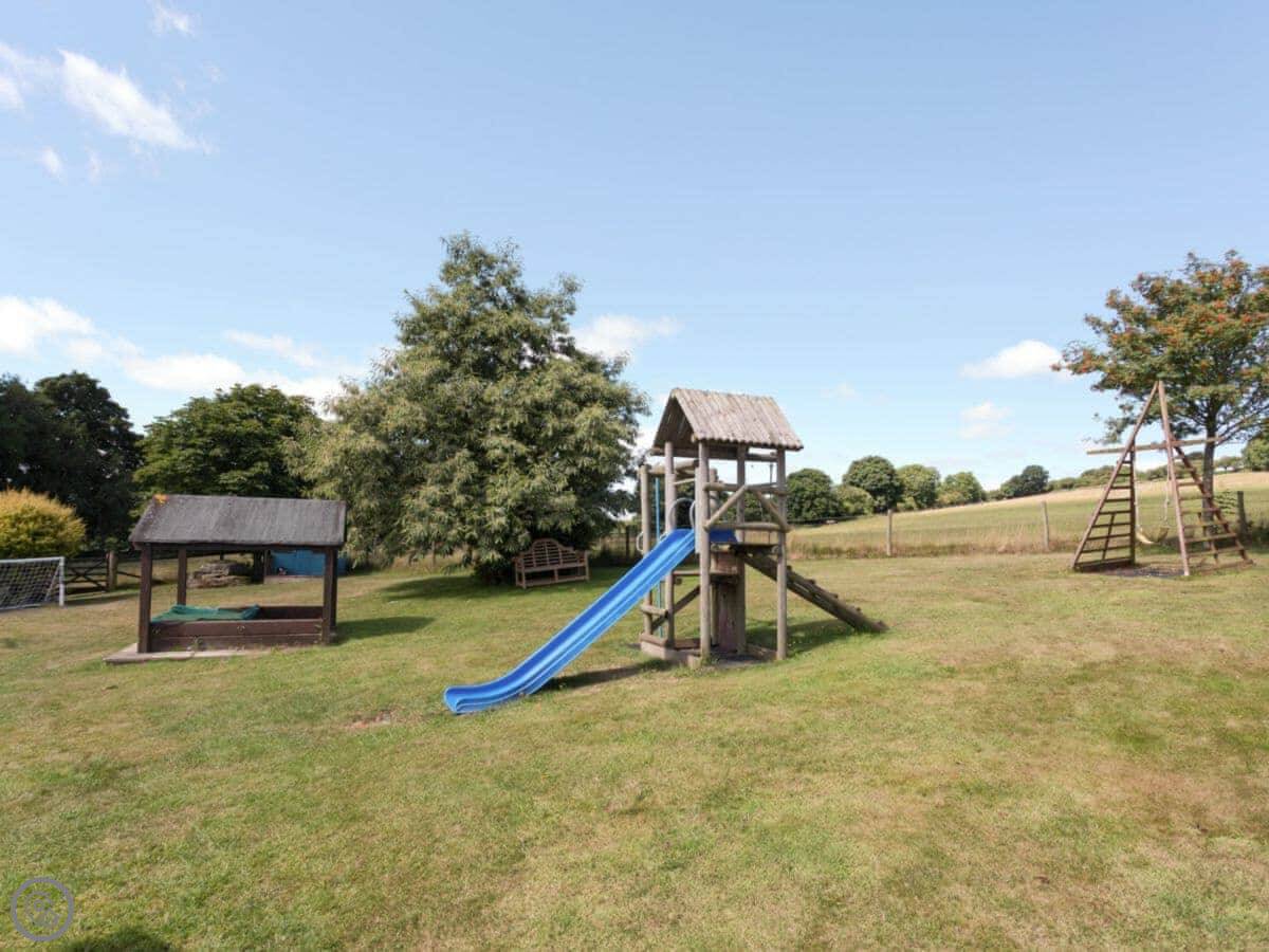 The farm has 32 acres. There's a heated indoor swimming pool for guests, a games room, and a kids' play area. You have your own enclosed patio with a barbecue. There's a firepit you can use. If the chickens are laying, you can take any eggs you find.