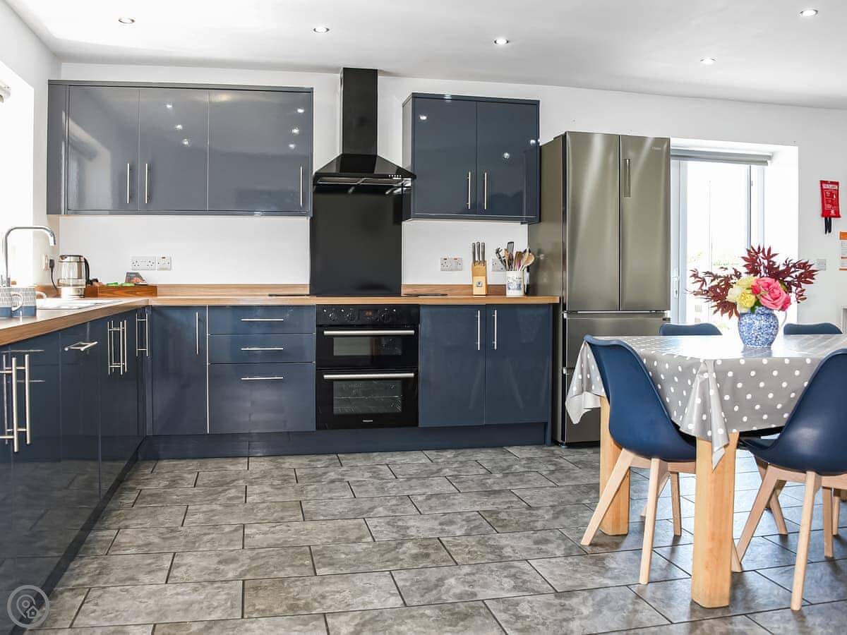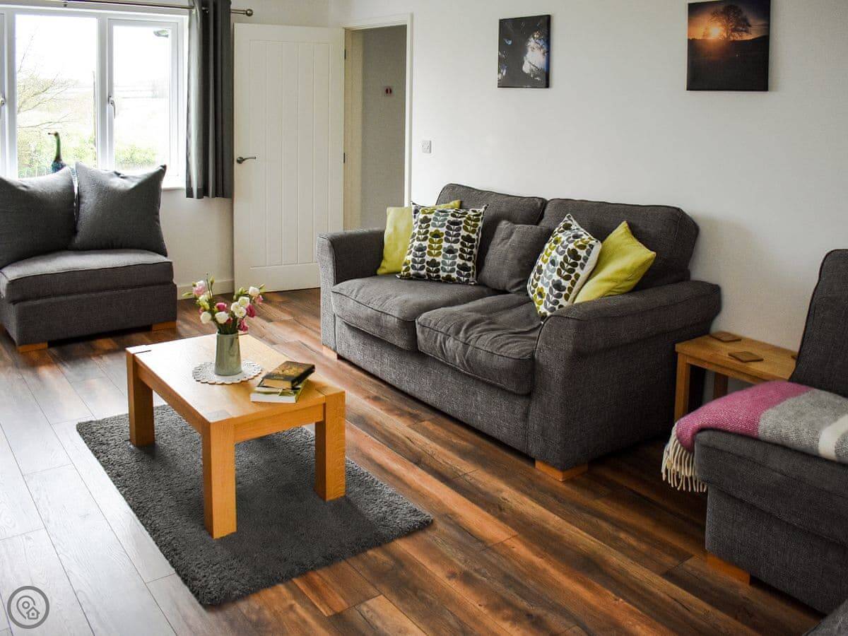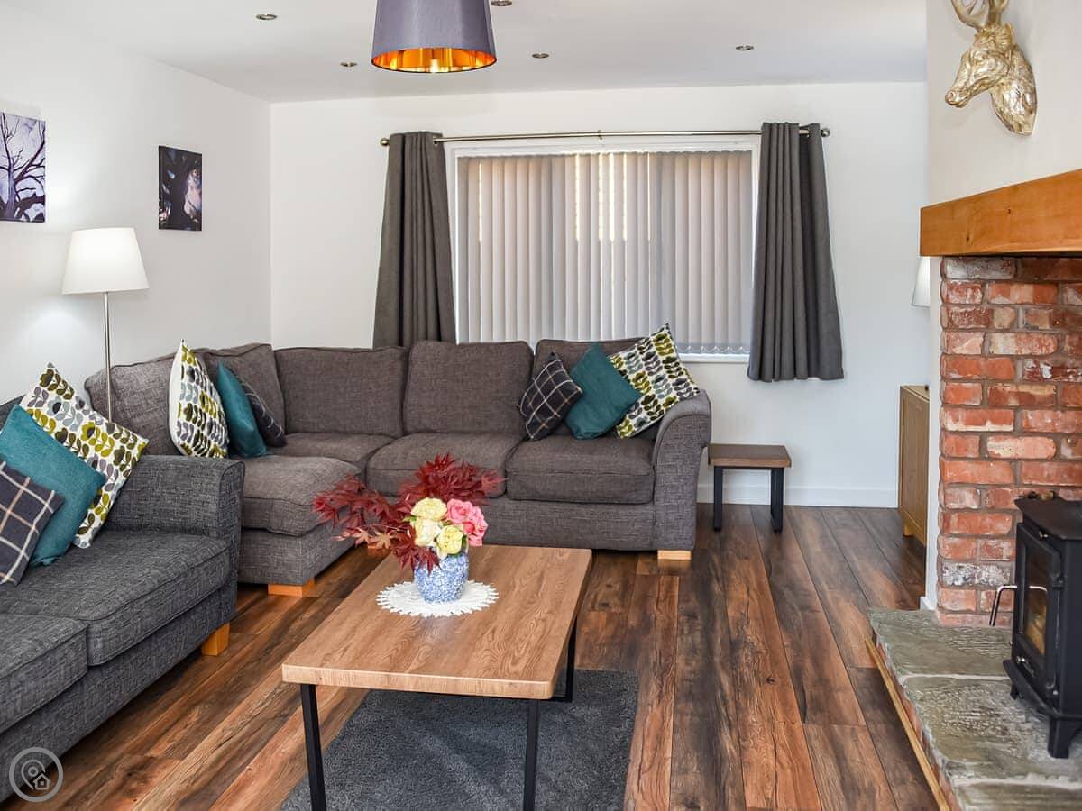 It sleeps eight people in four bedrooms. There are two bathrooms. It's a 5 Star place, which means it's well looked after and comfortable. The kitchen is big and modern, good for cooking together. The main living room has a wood burner, but there's underfloor heating from an air source heat pump, so it's always warm.