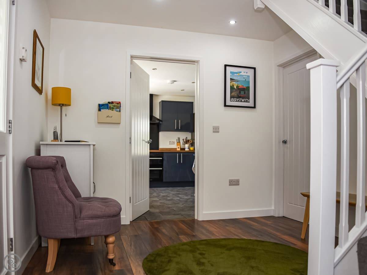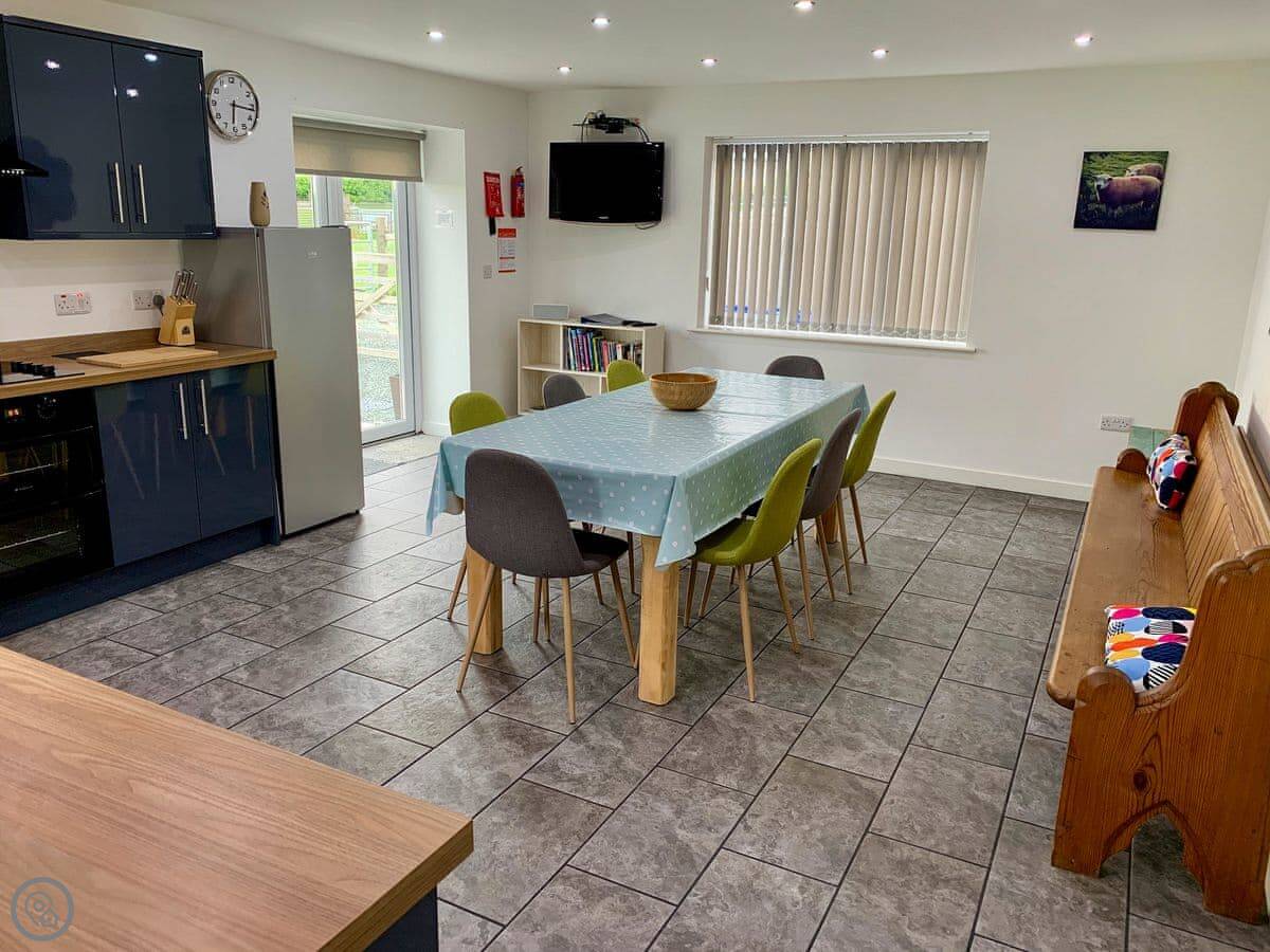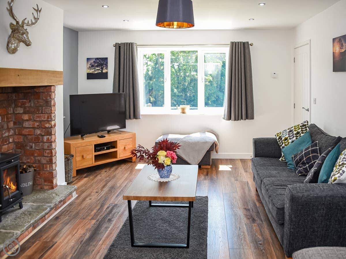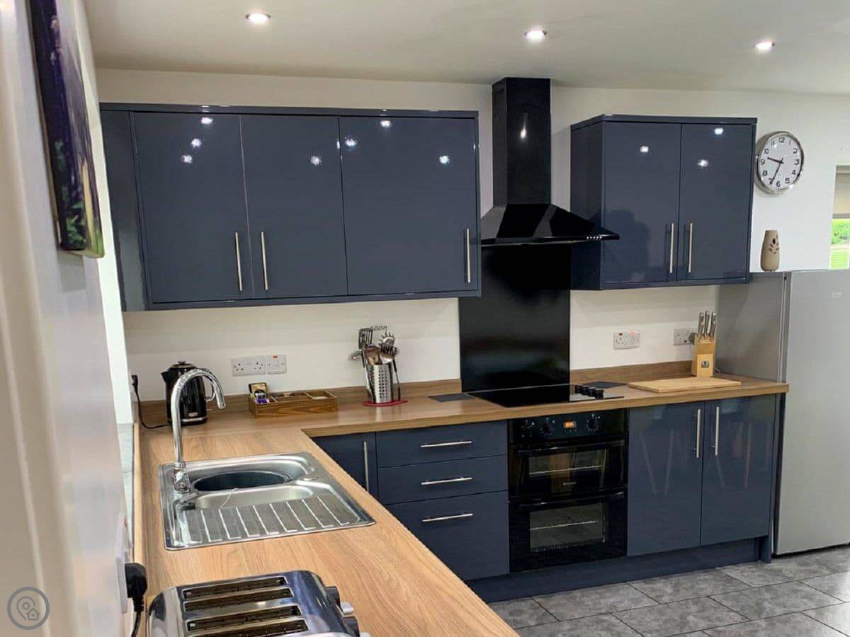 It sleeps eight people in four bedrooms. There are two bathrooms. It's a 5 Star place, which means it's well looked after and comfortable. The kitchen is big and modern, good for cooking together. The main living room has a wood burner, but there's underfloor heating from an air source heat pump, so it's always warm.