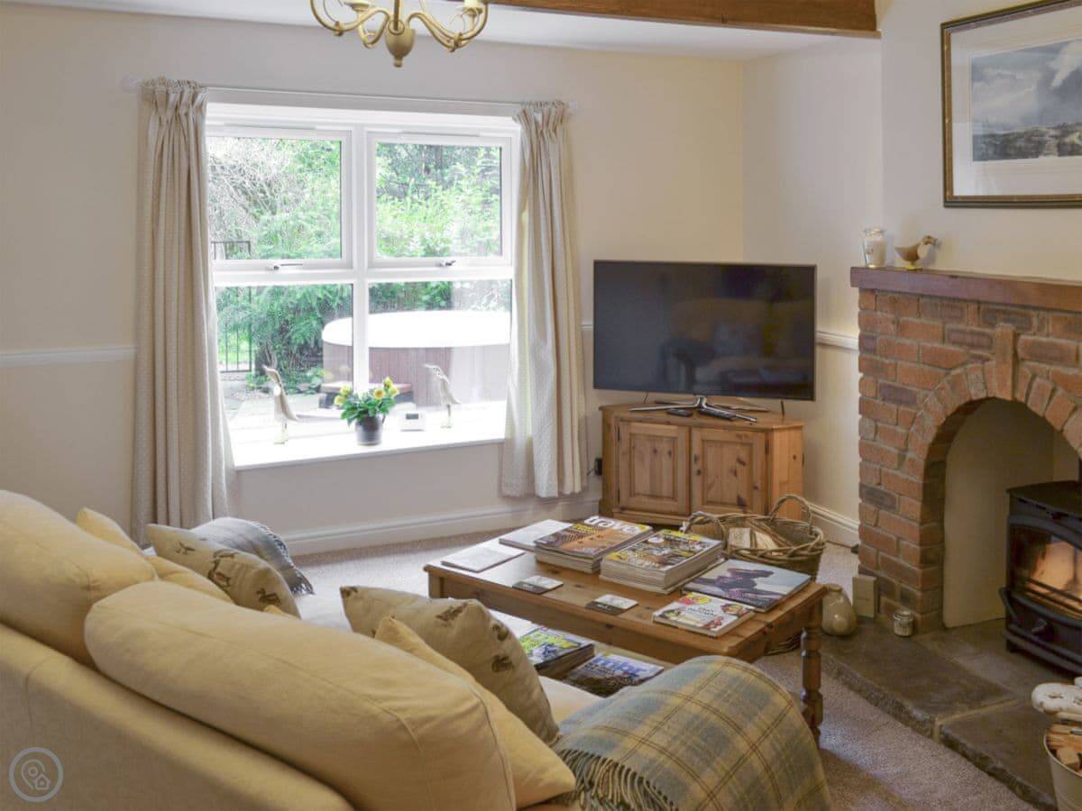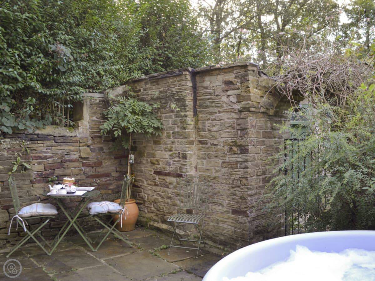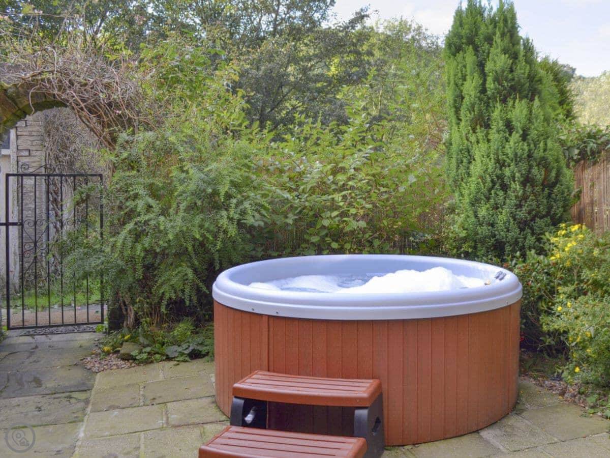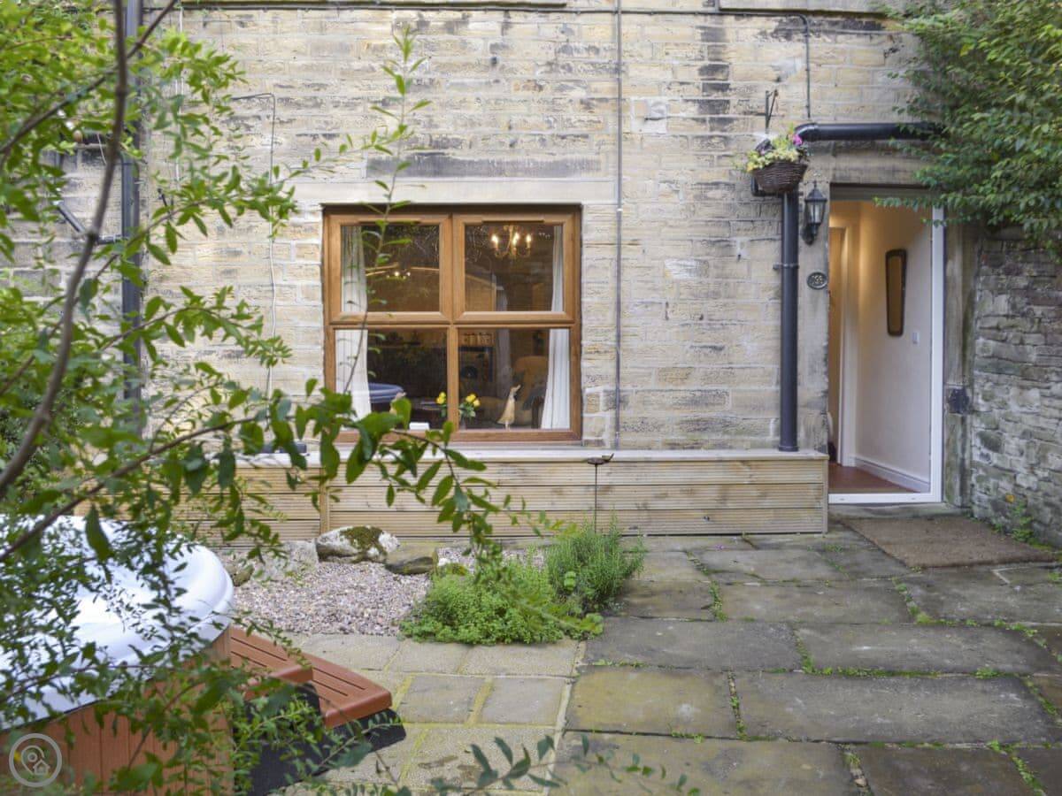 The main room is open plan with beams and a wood burner. Outside, there's an enclosed courtyard with a hot tub. You can hear the river from there.
