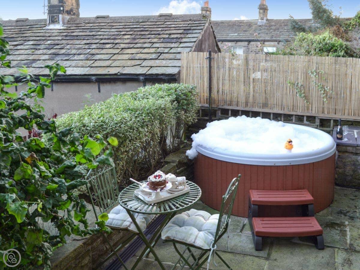 Outside, there's a split-level terrace with a private hot tub that looks out over the town.
