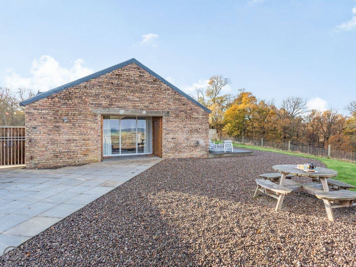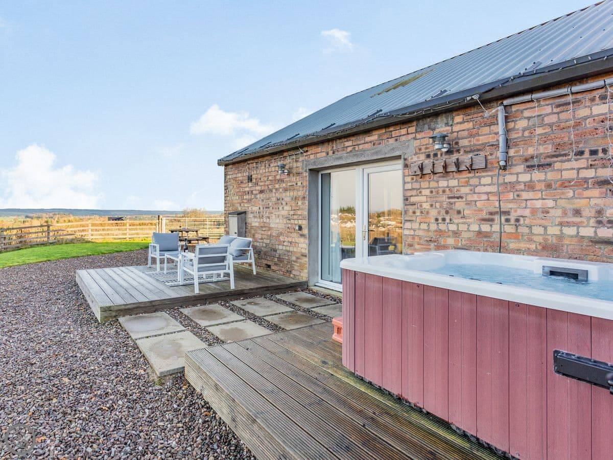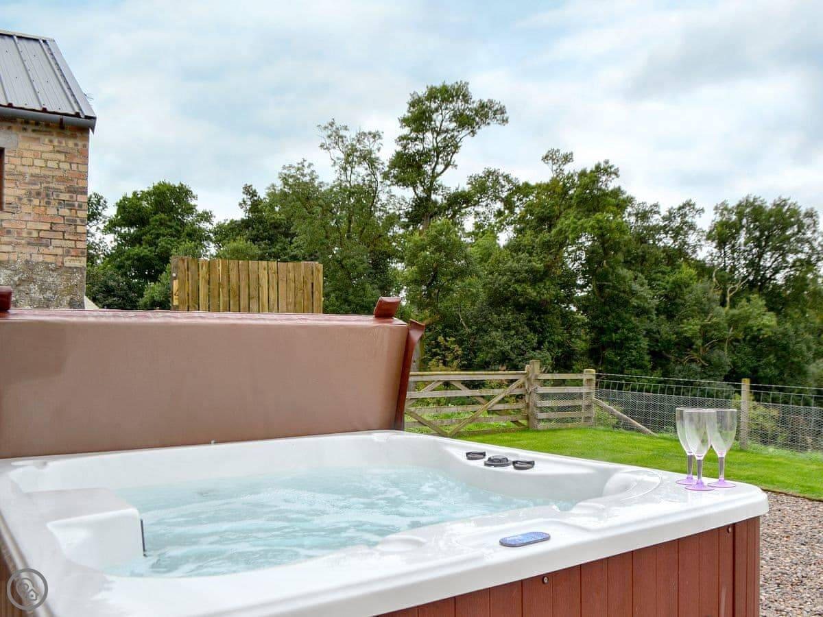 The barn is right next to our farmhouse. We’ve got Highland cattle and sheep in the fields. Sometimes you hear the trains go by on the old railway line, not too often. There’s a private hot tub in the enclosed garden, and a BBQ.