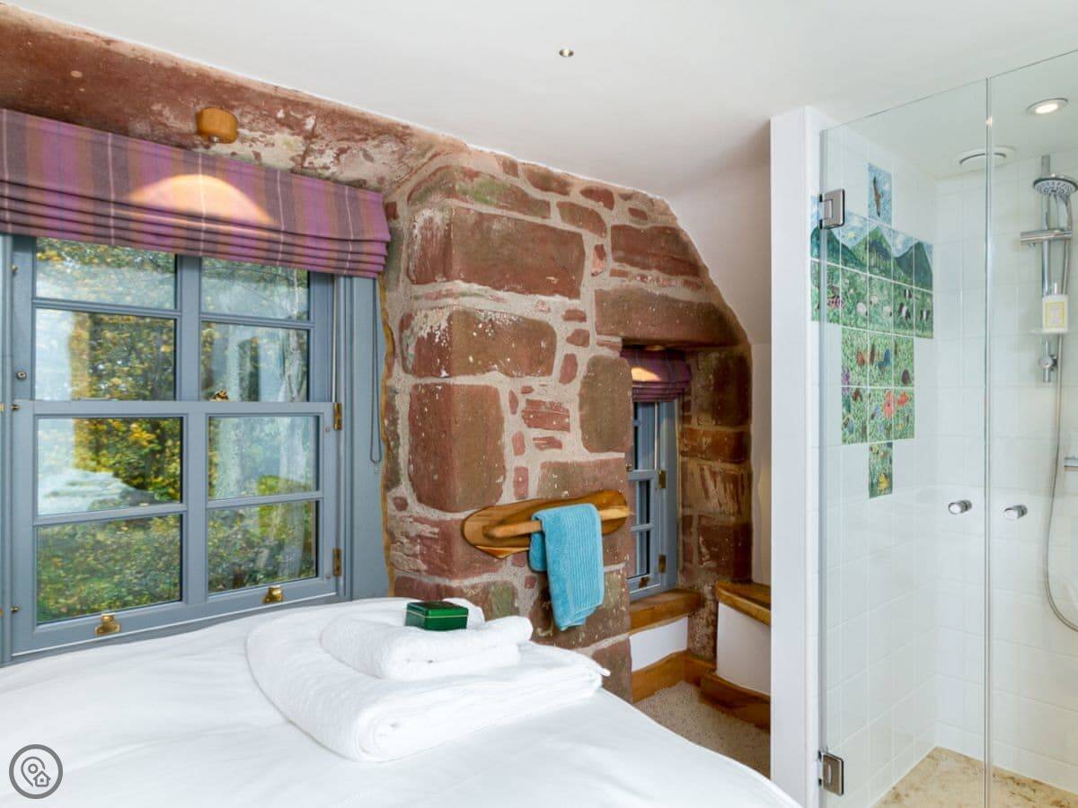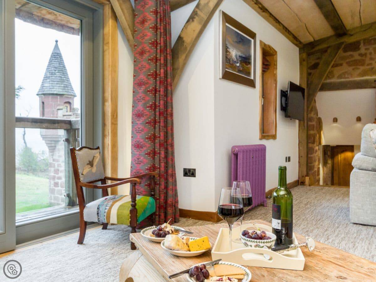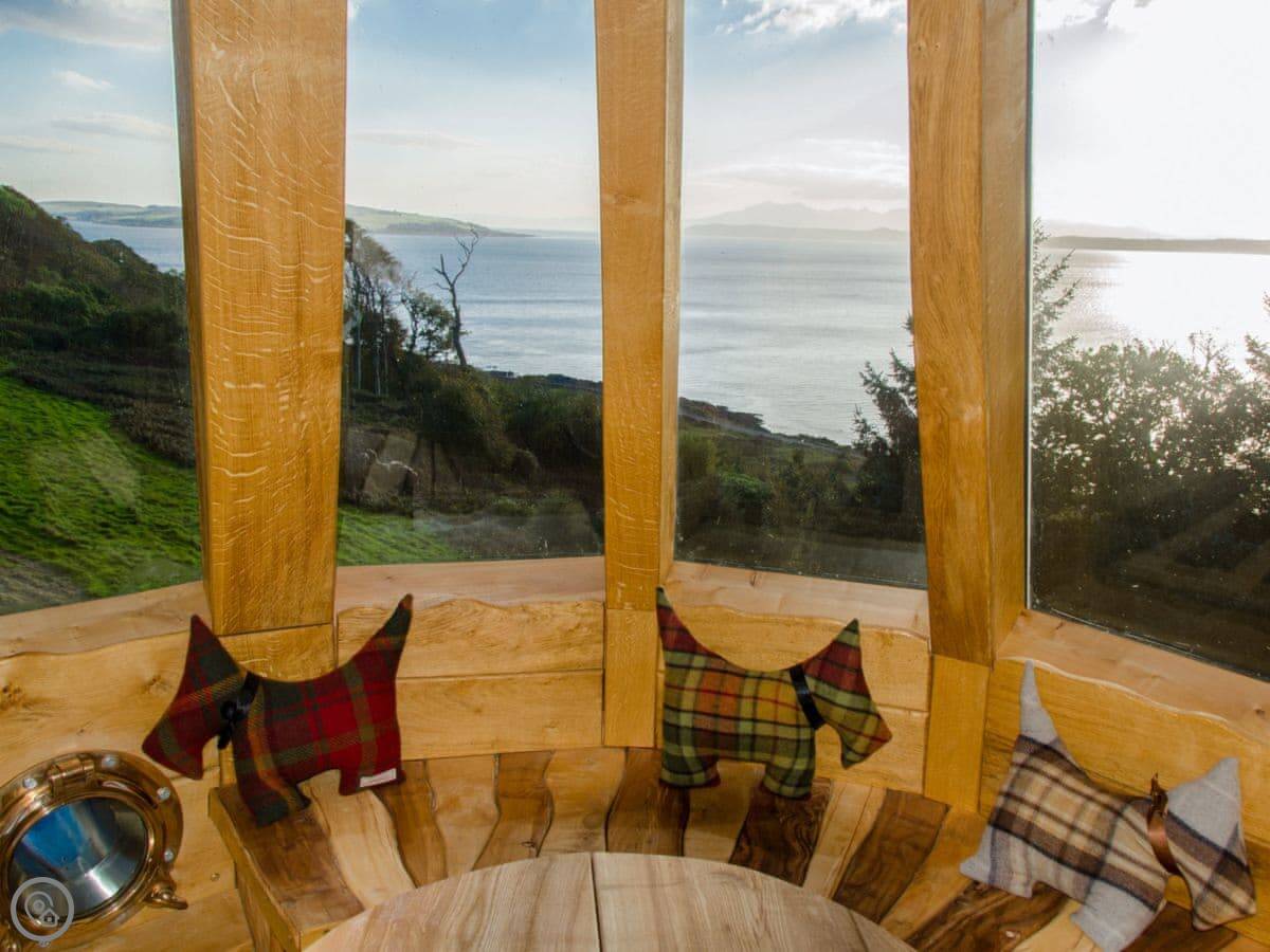 From the quirky doors and interior, where no straight lines will be found, to the sauna in the tower, and the painted ceiling in the keep, to the stunning views over the sea from the glass domed lookout, and not forgetting the sheep grazing on the wild flower roof. Old Knock Castle will be sure to exceed every expectation.