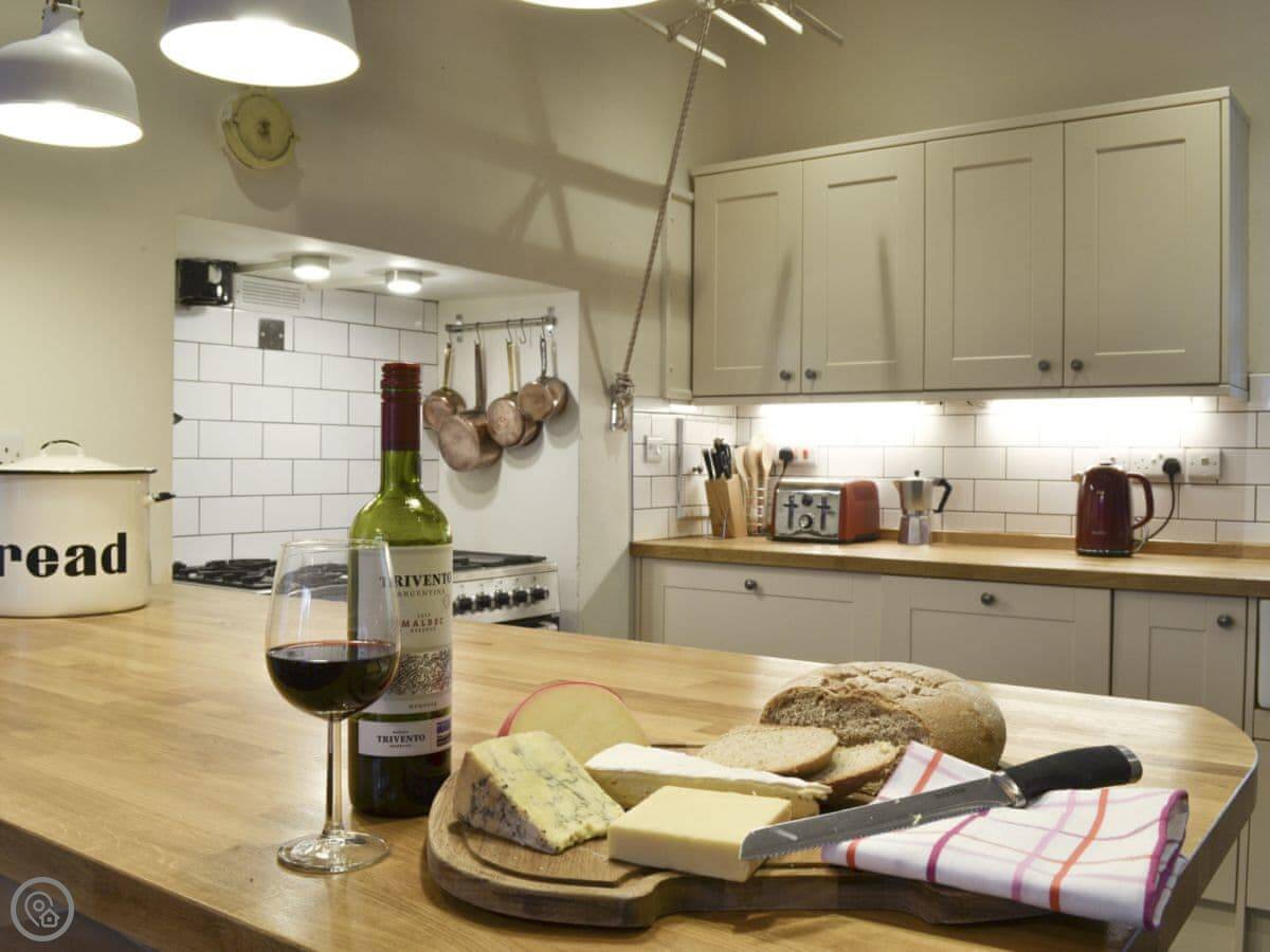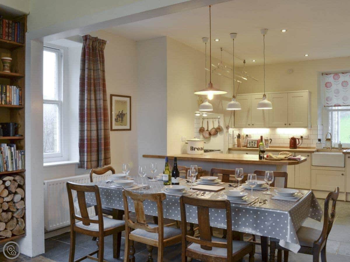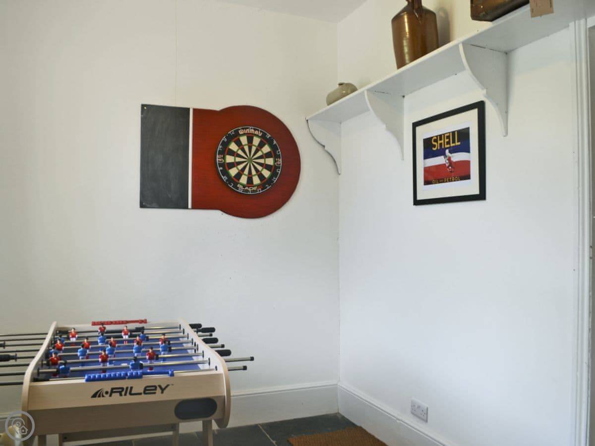 The kitchen is big, with a range cooker and a pulley dryer for clothes. It opens into the dining area. The living room has a wood burner. There's a separate games room with table football and a dartboard.