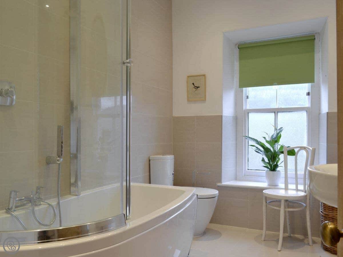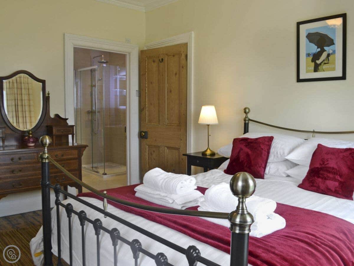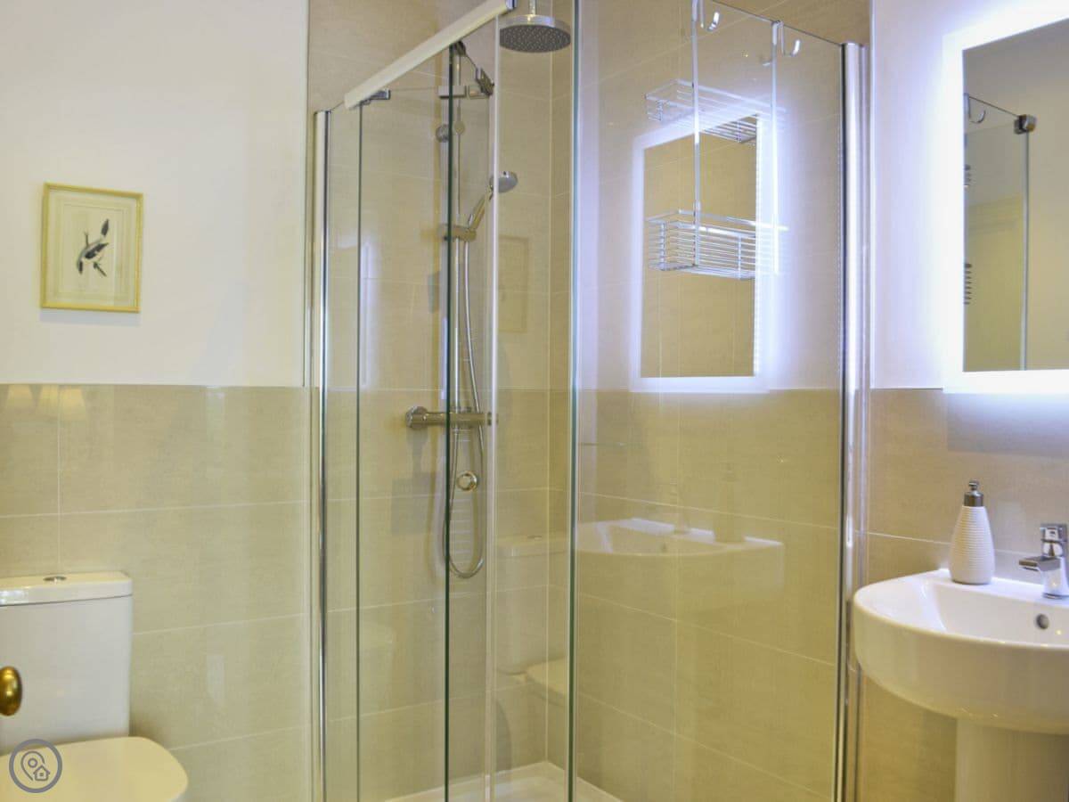 It sleeps eight people in four bedrooms. There are two bathrooms, one is an en-suite shower room in the main bedroom. It's got a 4 Star rating. The floors are original flagstones in some parts, so they're hard and a bit uneven. The stairs are normal.