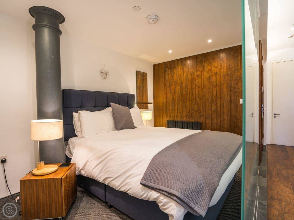 It sleeps four, but there's only one bedroom. That bedroom has a double bed, and then there's a sofa bed in the living area for two more. One bathroom with a shower.