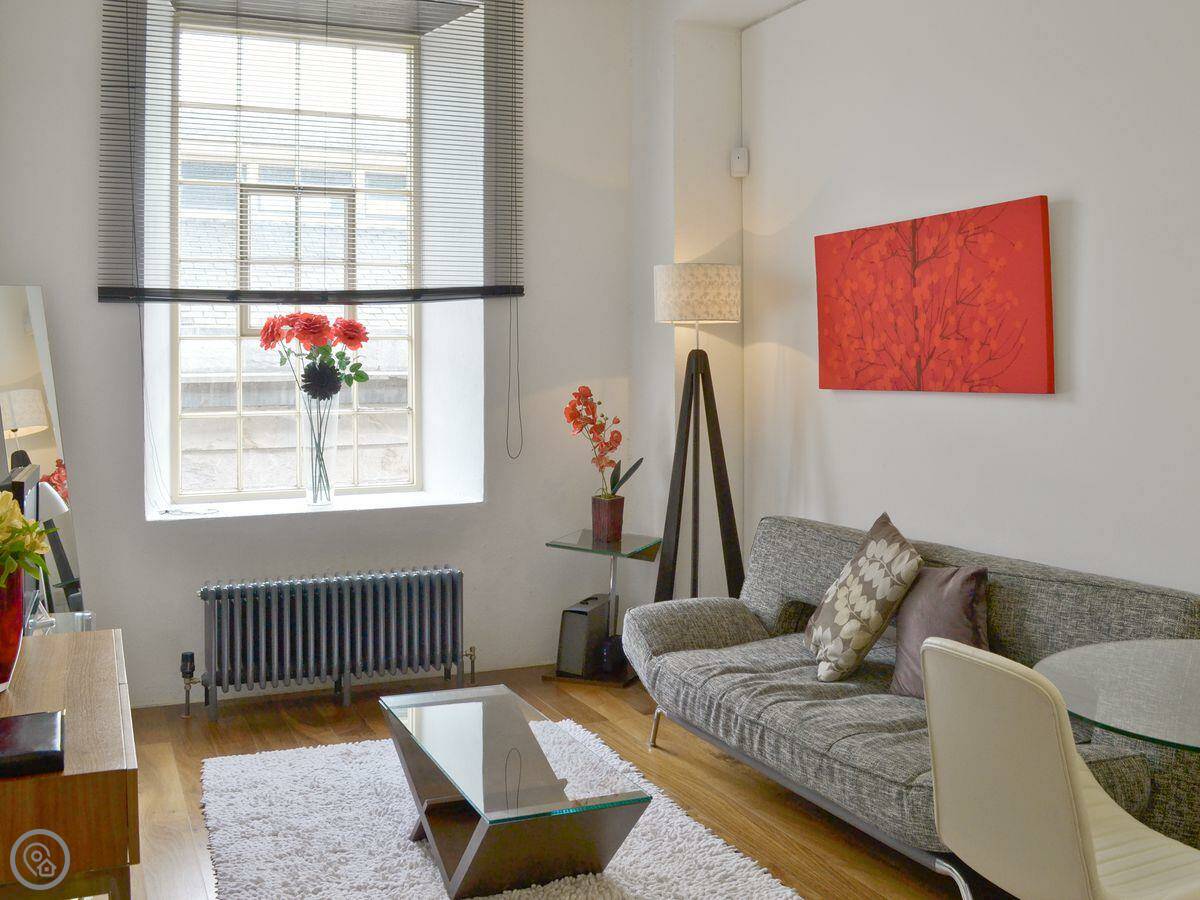 The building used to be a navy supply yard. It's been converted now, so you've got these old stone walls and big arched windows. Inside it's modern. It sleeps two people. It's got a 4 Star rating, which means it's well equipped and comfortable.