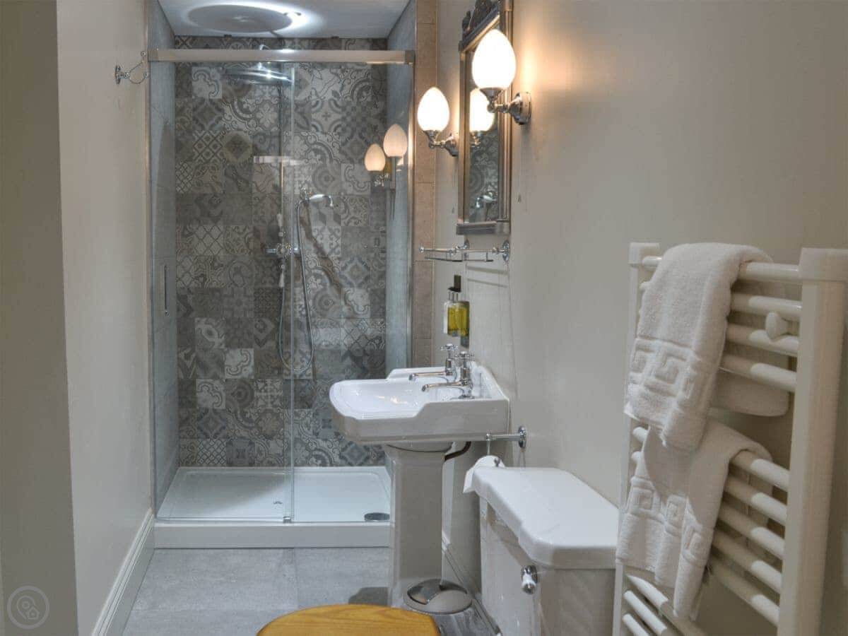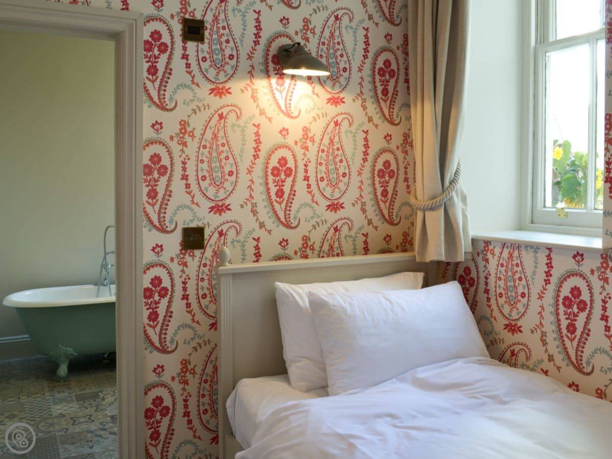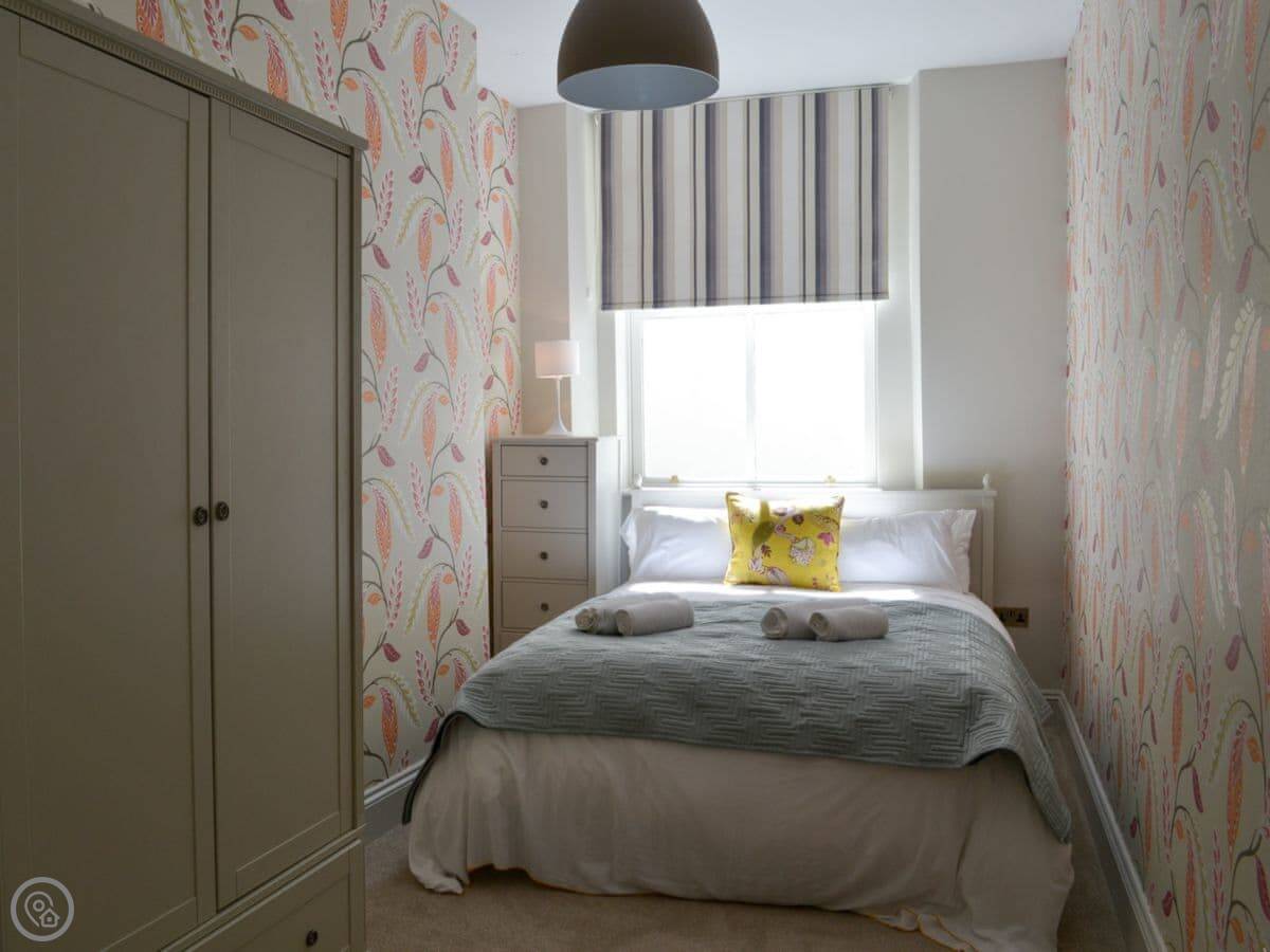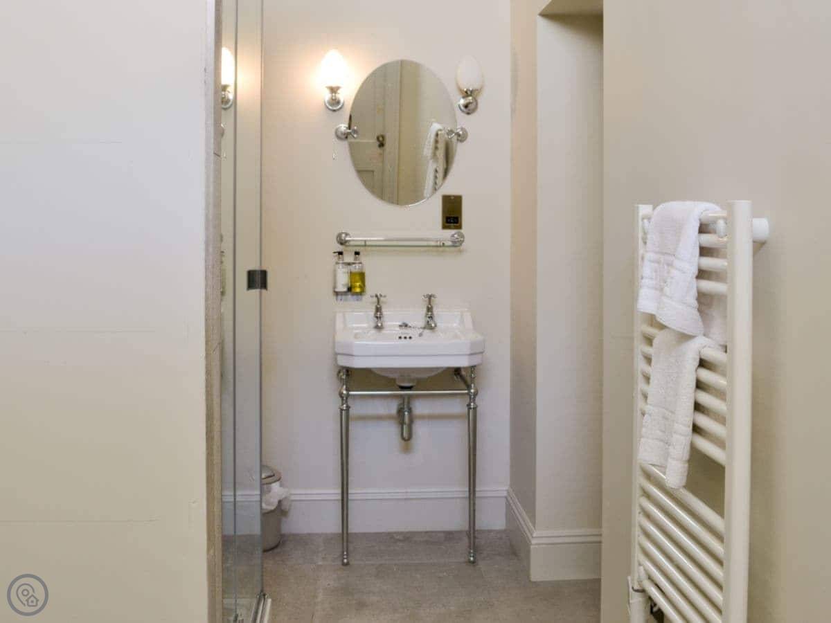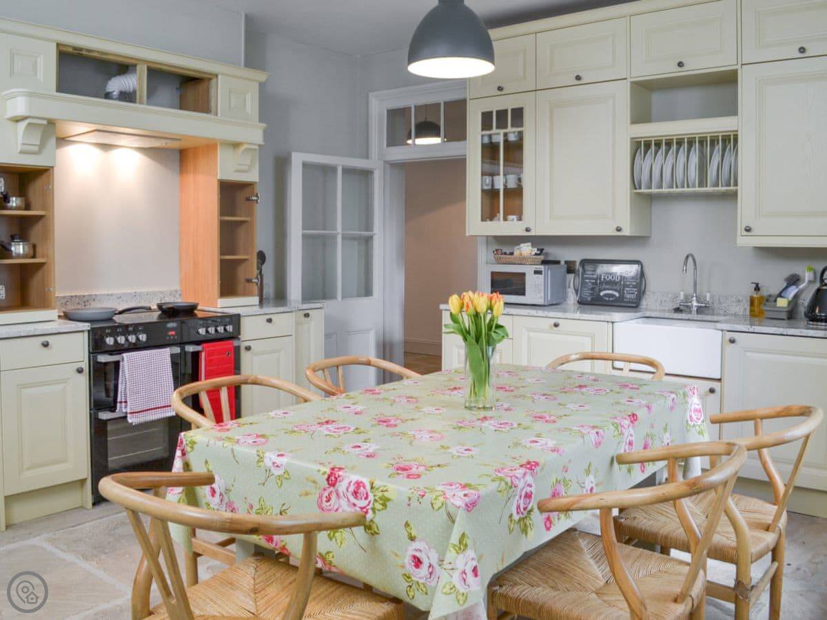 It sleeps nine people. Four bedrooms, two bathrooms. It's got a 5 Star rating, which means it's well-equipped and comfortable. The building is listed, so the walls are thick and the windows are tall. You get a proper sense of the history here.