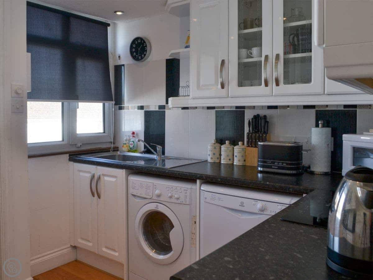 For facilities, it's got what you'd expect. Wifi, TV, washing machine, dishwasher. Bedding and towels are included. There's parking on site. You can bring one dog.