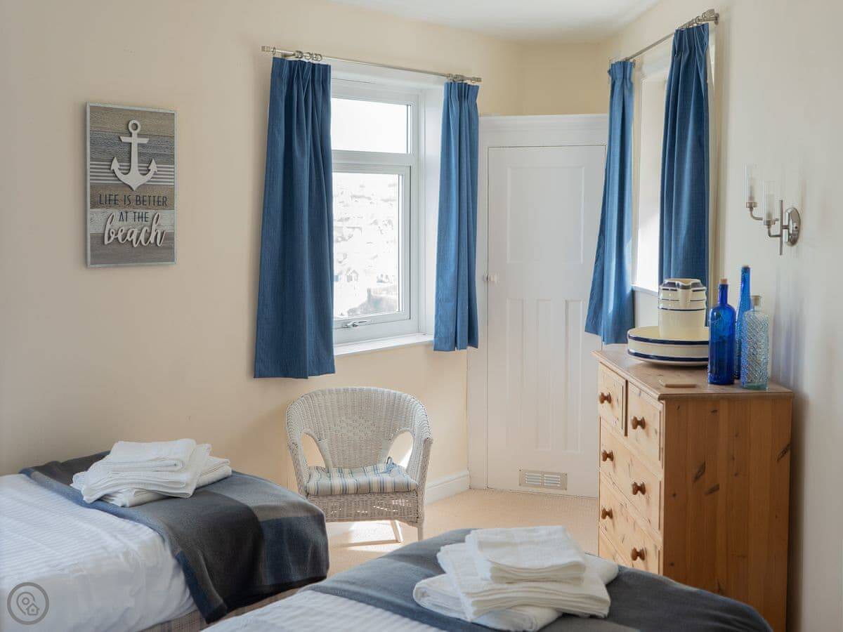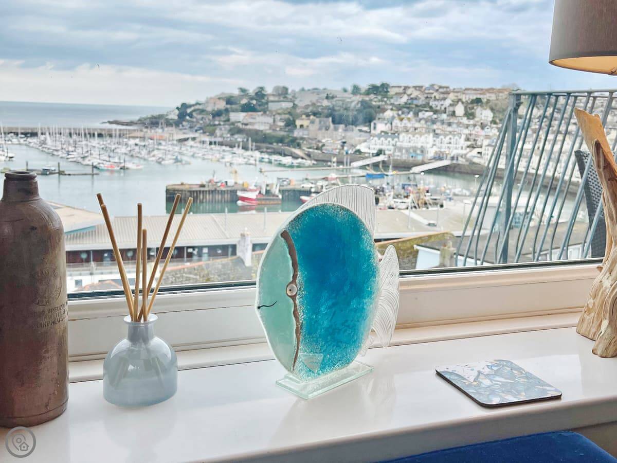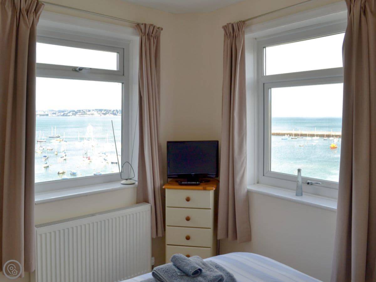 It sleeps four. Two bedrooms, one bathroom. The shape is a bit odd, it's like a triangle, because of where it's built on the hill. That means you get windows facing two ways, so you see a lot of the harbour and the sea from inside.