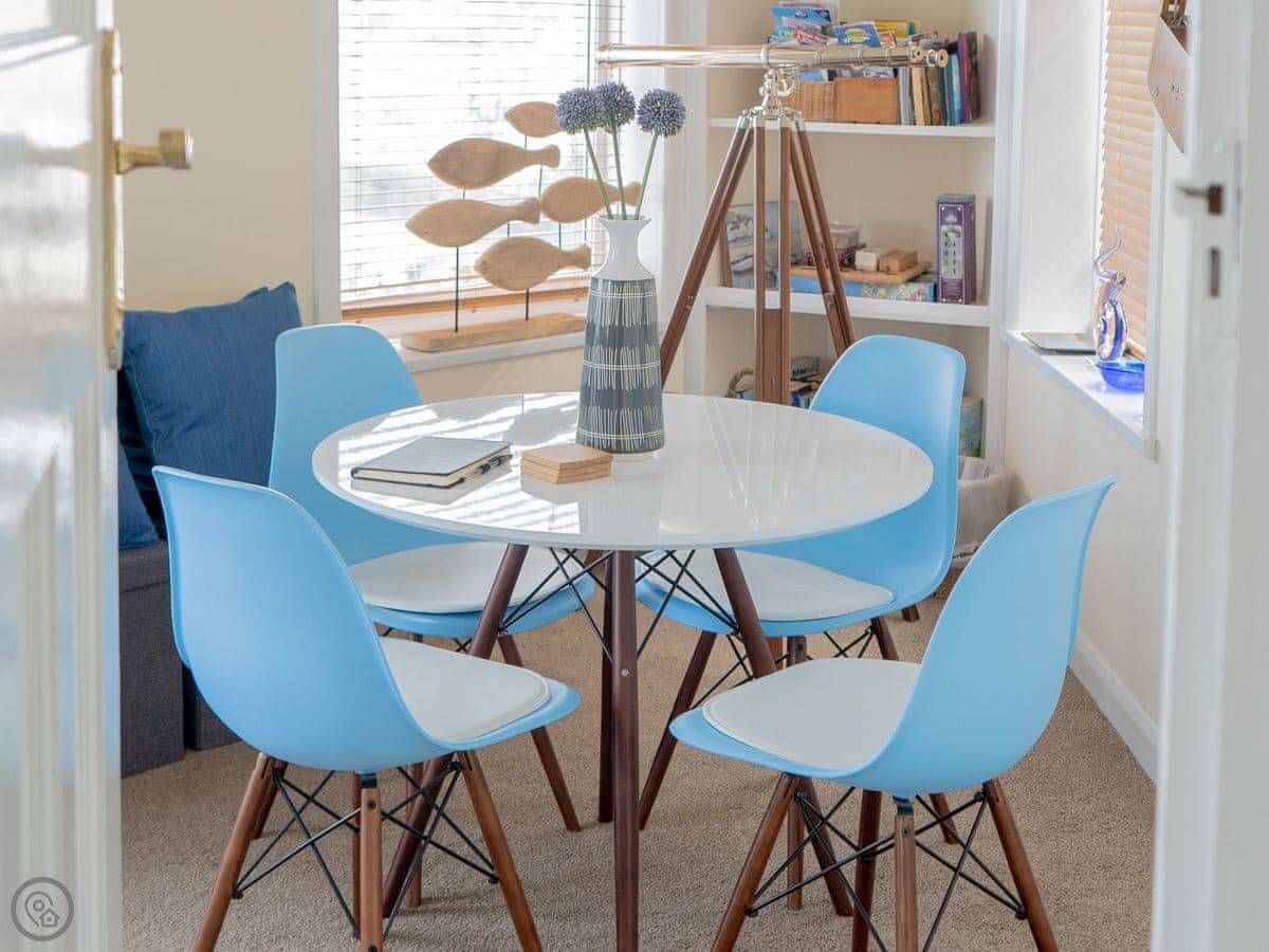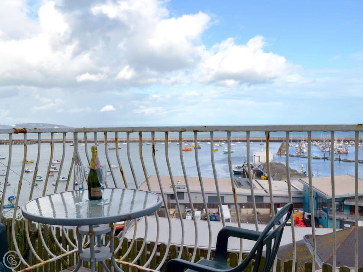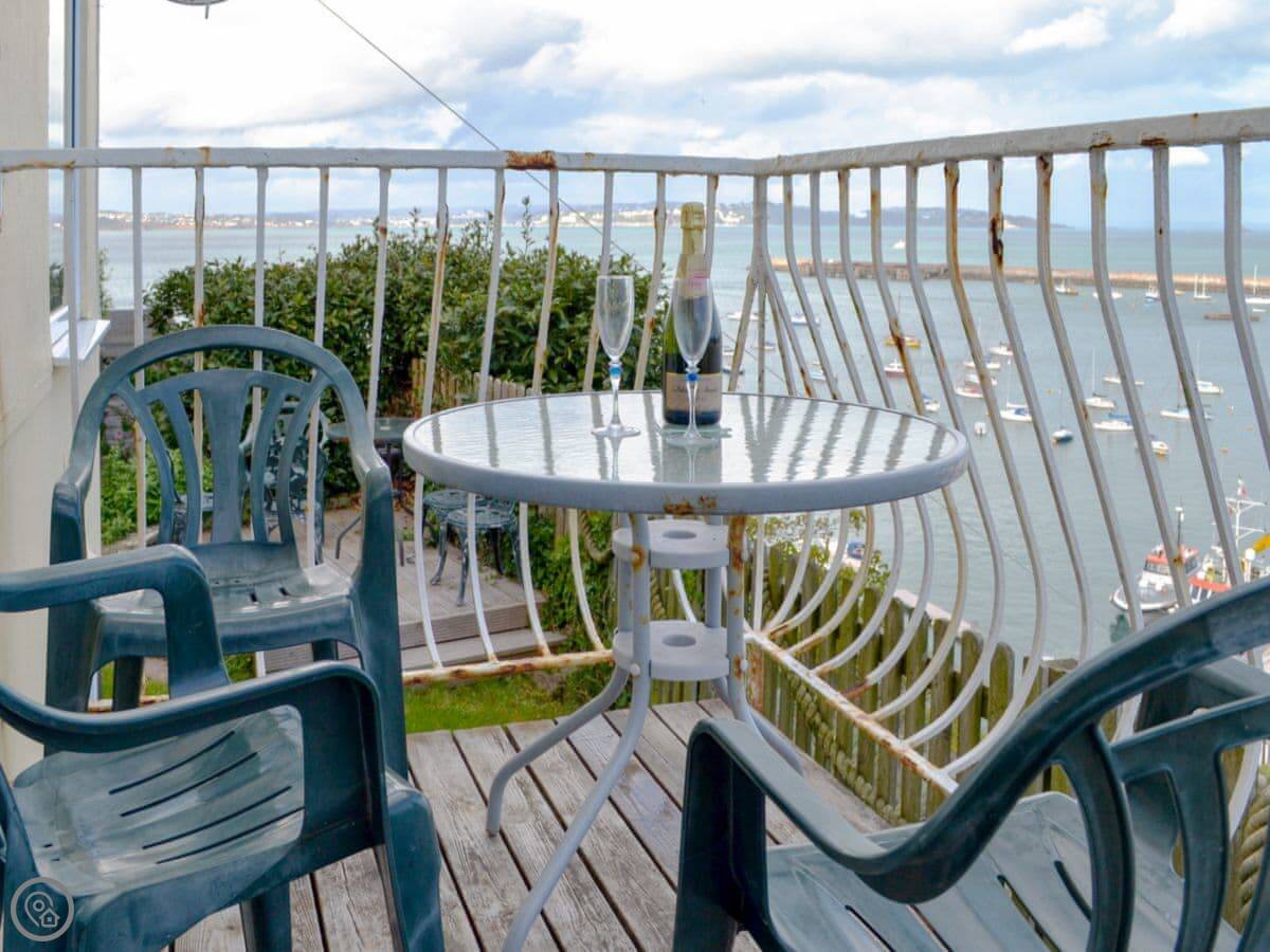 There's a small balcony off the living room, just enough for two chairs. You can sit there and watch the boats. The garden is down some steps, it’s got a table and chairs. You can see the water from there too.