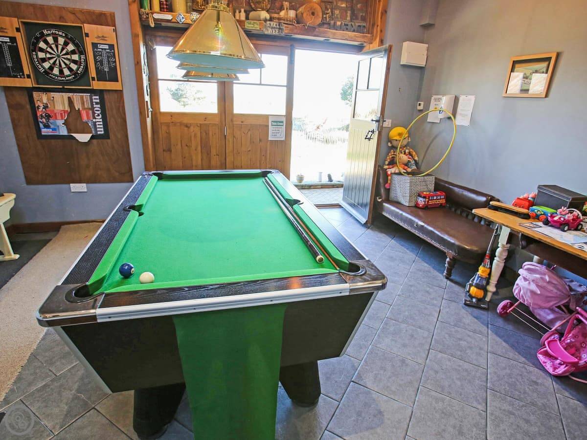 Inside, it's straightforward. Underfloor heating downstairs, a wood burner upstairs in the living area, a TV in each bedroom, and a washing machine and dishwasher. All the bedding and towels are included. There's also a games room with a pool table in a shared barn, which you can book for a private slot.