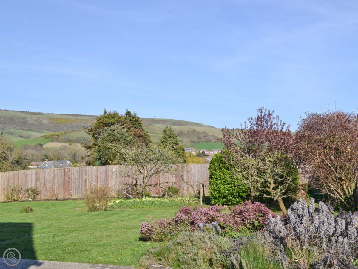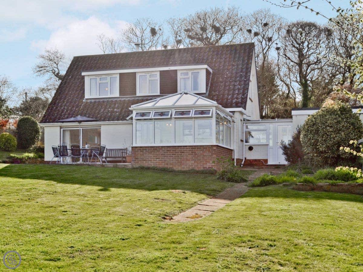 Sandrock is in Brighstone, down a quiet lane. It’s detached, so no one next door. The garden is lawned and enclosed. The view from the back is fields, all the way out to the sea in the distance.