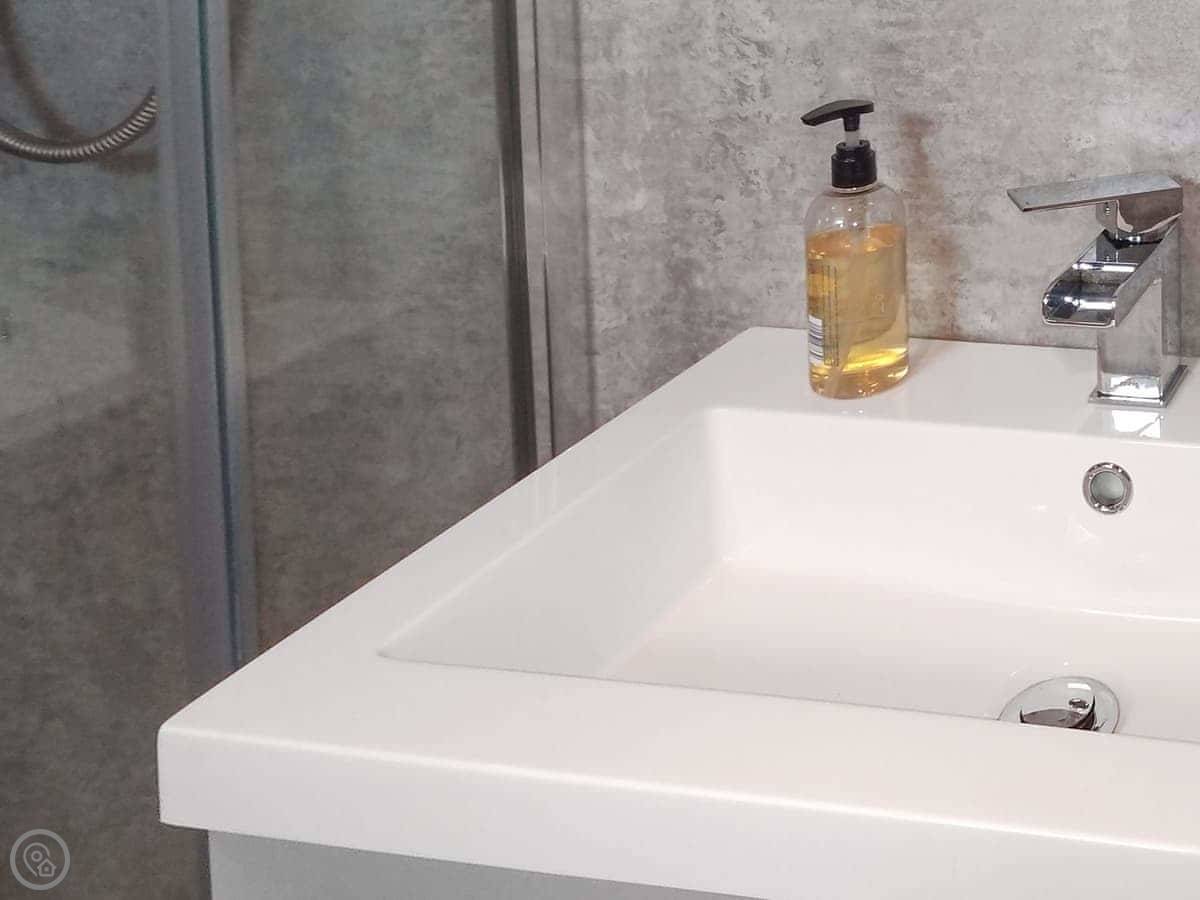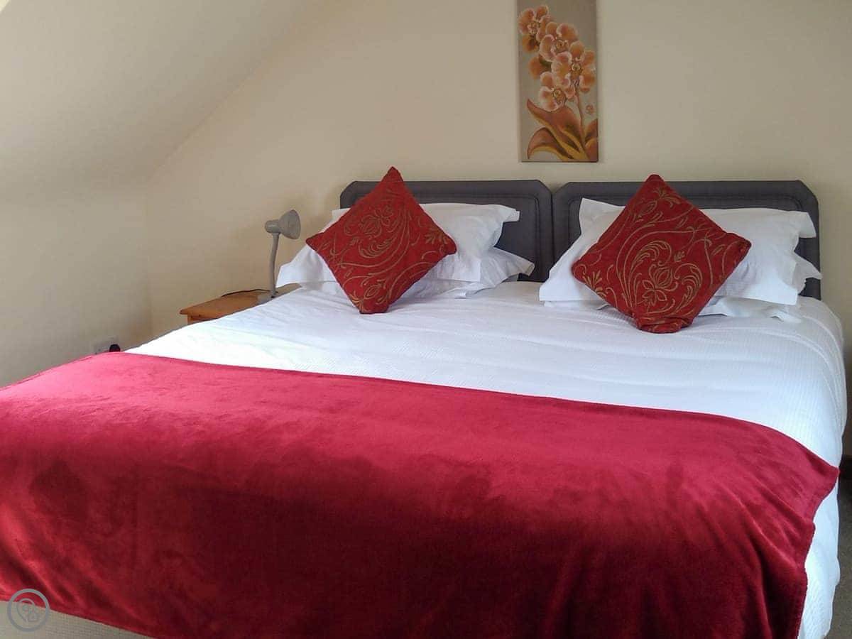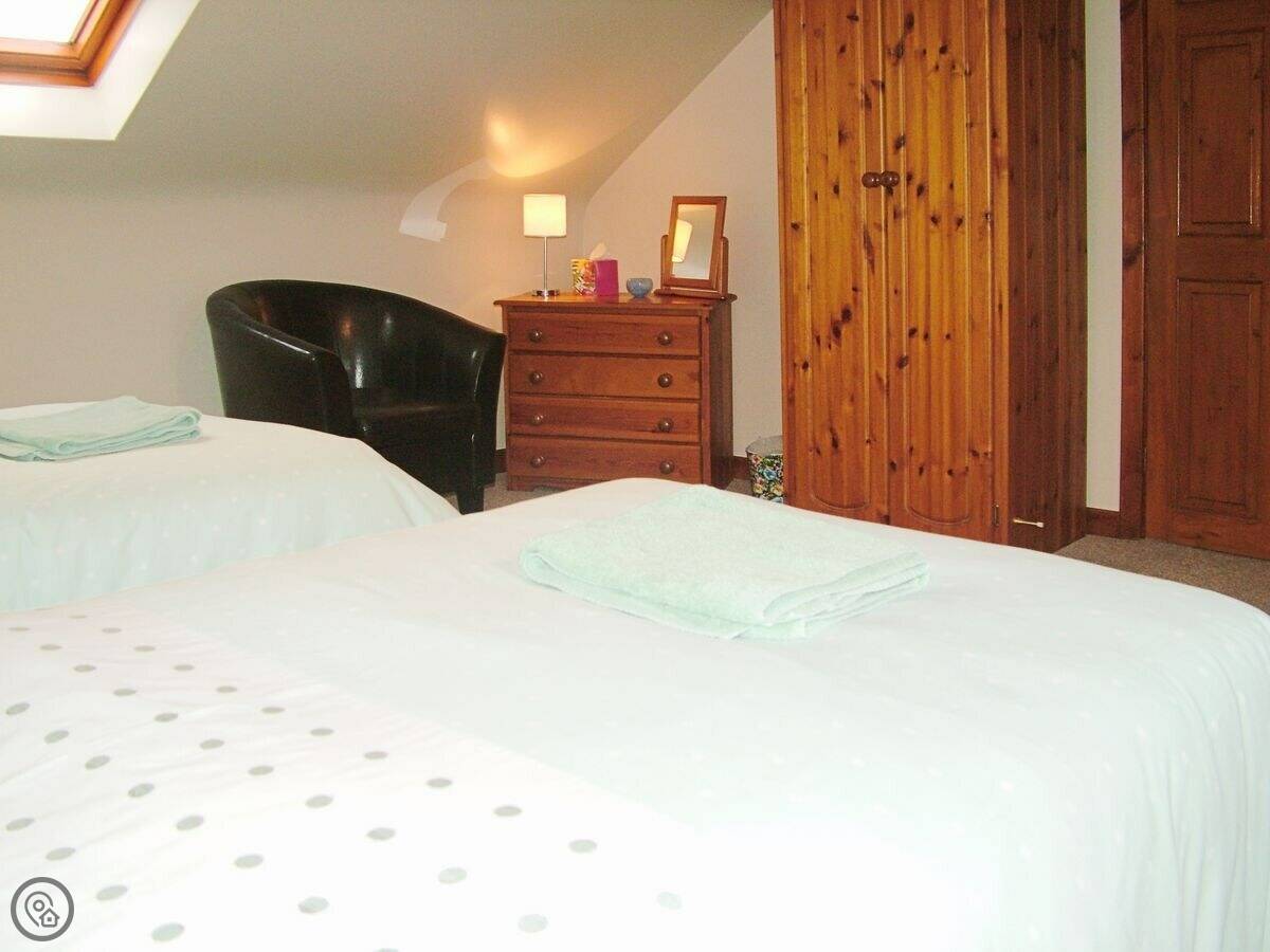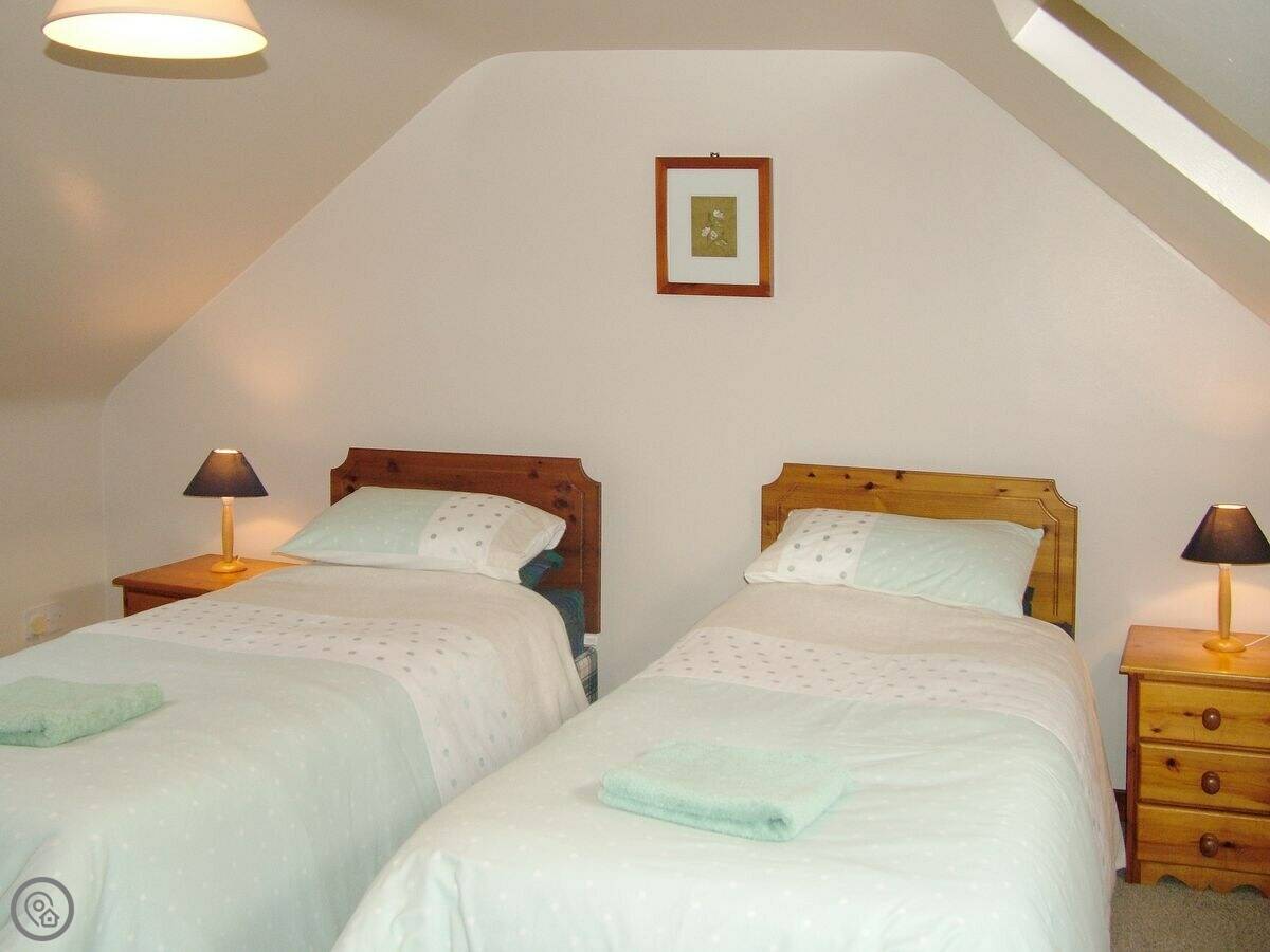 It sleeps four, in two bedrooms. There's one bathroom with a shower. It's a 3 Star place, so it's clean and has what you need, but it's not posh. The stairs are the main thing to know about. They're in the middle of the living space, they're a spiral, and they're fairly steep and narrow. We've put a stairgate at the bottom.