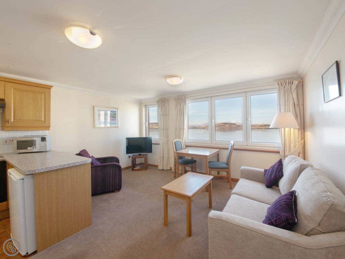Esplanade Court is situated in a particularly superb location overlooking Oban Bay, on the lovely west coast of Scotland. The holiday apartments have qualified for the STB 4 Star rating. They are equipped and furnished to a good standard with each one having a panoramic view over the bay and out to the isles of Kerrera, Mull and Lismore. Oban is a lively west coast town with lots going on for the visitor. It is central for touring the west coast, or take a boat trip to the above islands and Iona which leave daily. There is a lovely sandy beach at Ganavan which is 1½ miles away. There are some very good restaurants in which to eat dinner in the evening, after maybe a days climbing, walking or enjoying some of the wonderful animal and plant life which the west highlands has to offer. Elevator to all floors.