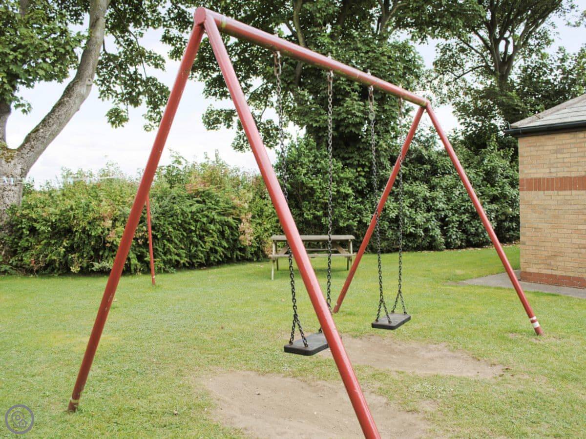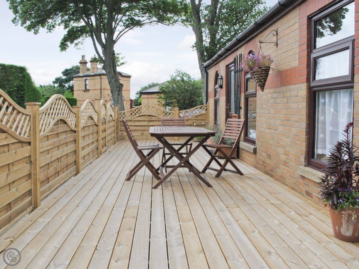 It sleeps six people. There are three bedrooms and two bathrooms, so that’s handy. It’s got a 3 Star rating, so it’s clean and comfortable but not luxurious. You’ve got your own enclosed decked patio out the back, with a table and chairs. There’s also a shared garden with a play area for kids.
