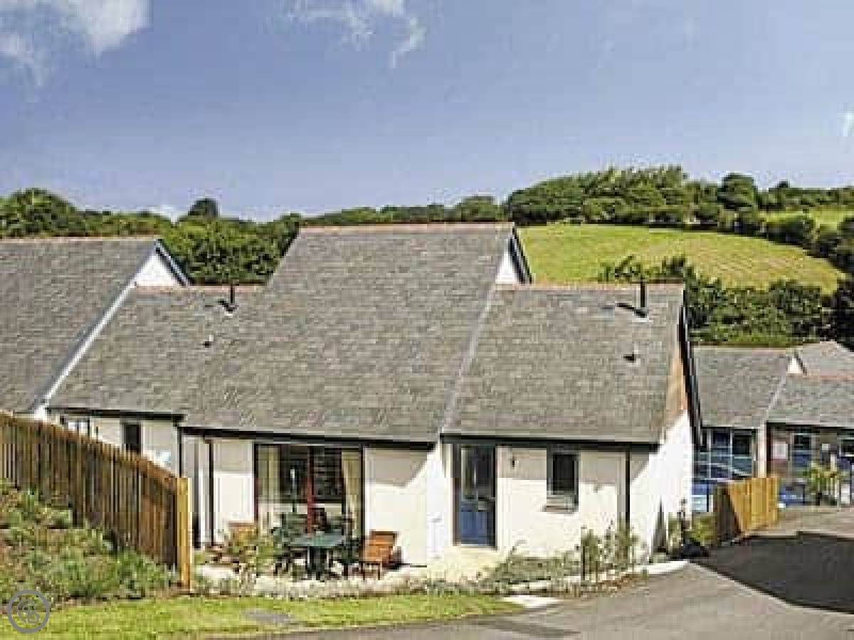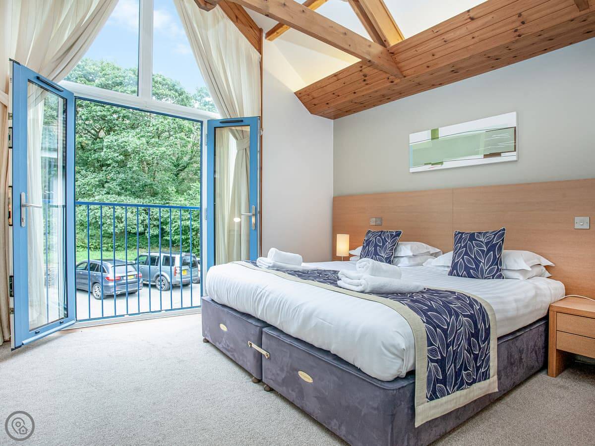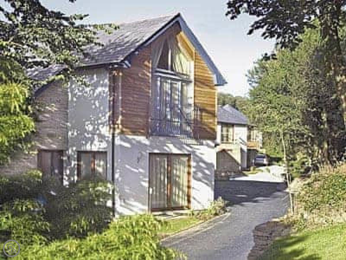 This is a cottage on the Ringwell estate in Cornwall. It's called Haven-78. It's one of a group of architect-designed places built with local stone and cedar. They're modern inside but the materials make them feel part of the landscape. You get a patio and a balcony.