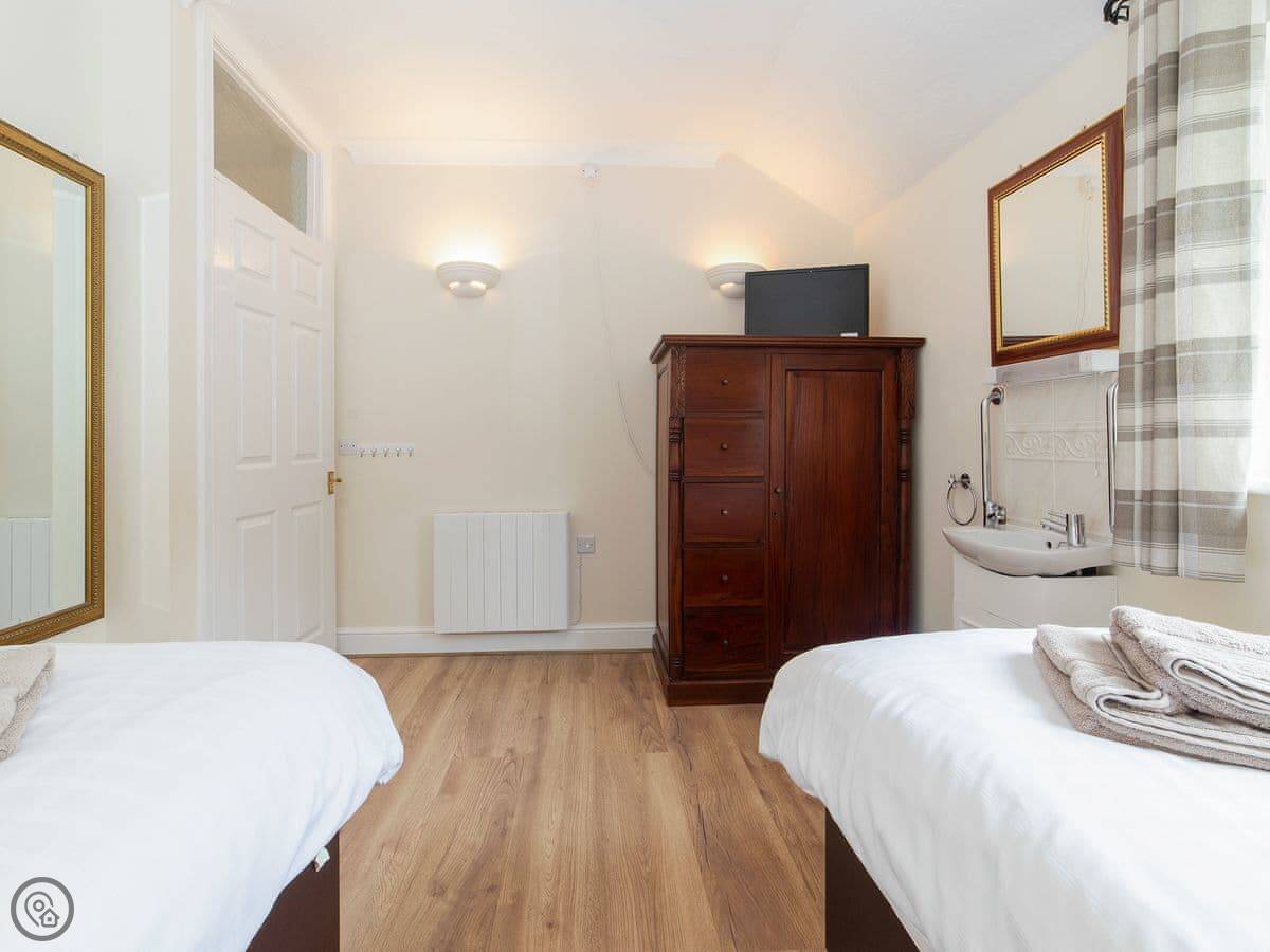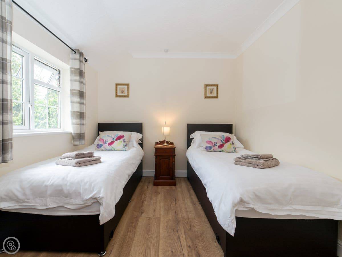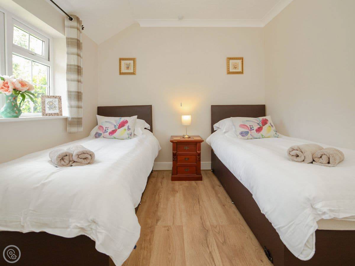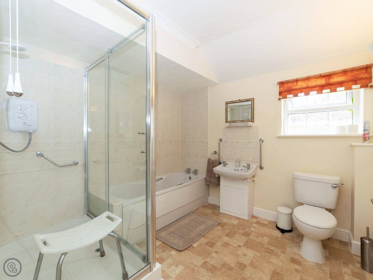 It sleeps four. Two bedrooms. One bathroom with a walk-in shower. There's no bath. It's all on the ground floor so it's good if steps are difficult. There are grab rails in the shower and a seat.