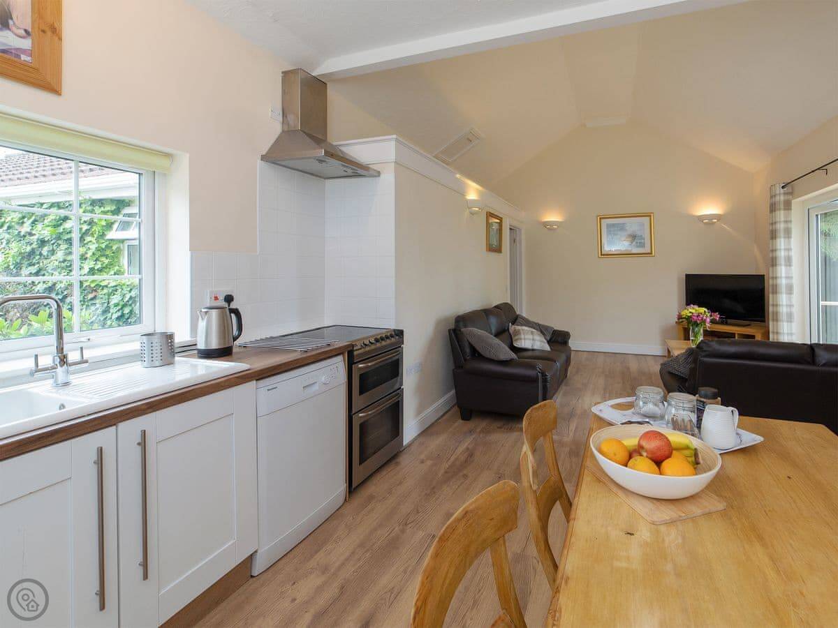 The space is open plan. Kitchen, living area and dining bit are all together. You've got a washing machine and a dishwasher. The WiFi works. There's a patio with a table outside.