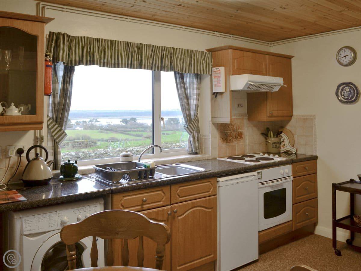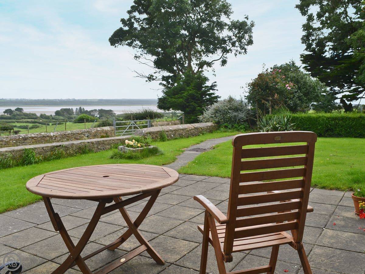 It sleeps four. Two bedrooms, one bathroom. It's got a 3 Star rating, which means it's comfortable, clean, and works well, but it's not a show home. The French doors in the living room open onto the patio. The view from there is the best part. You look right out over the Malltraeth estuary towards the mountains in Snowdonia.