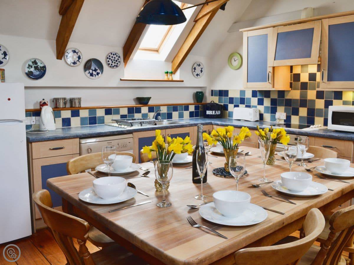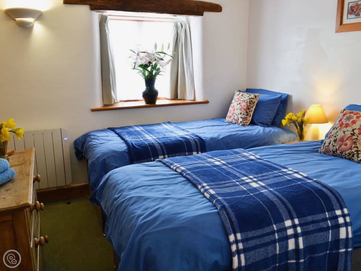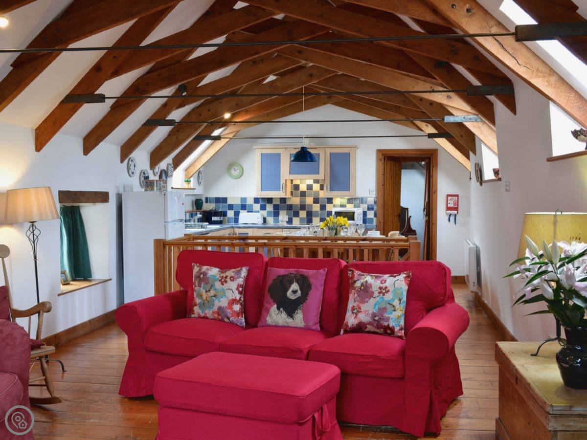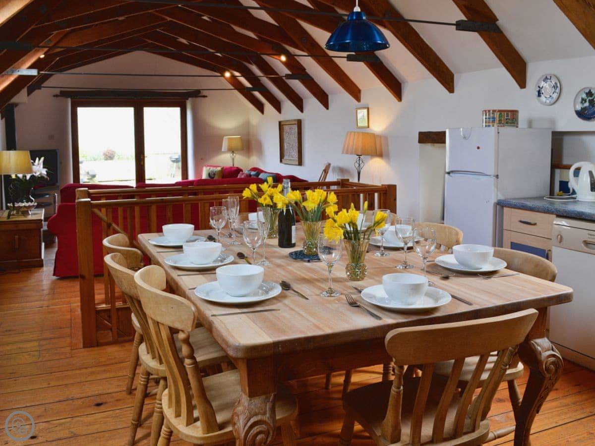 The place itself is a barn conversion, part of a small courtyard with a few other cottages. It sleeps eight. Four bedrooms, three bathrooms. It's got a 3 Star rating, which means it's comfortable and clean rather than polished. Because it's a barn, the ceilings upstairs can be a bit low in places.