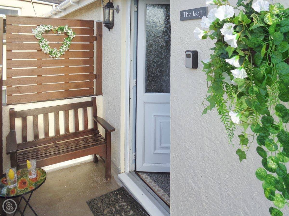 The Loft is in Penysarn, on Anglesey. It's an apartment for two people, up a flight of stairs. It's part of a small row of three places, around a shared courtyard.