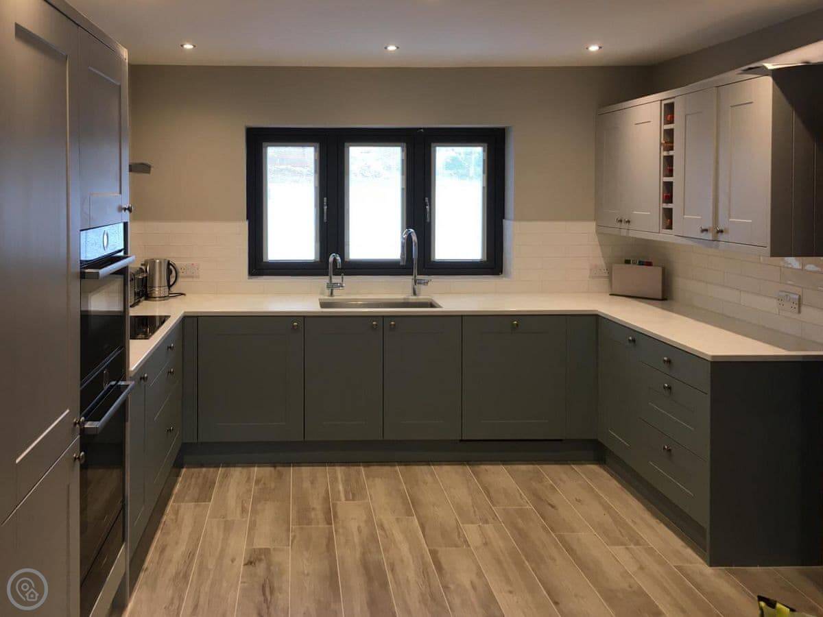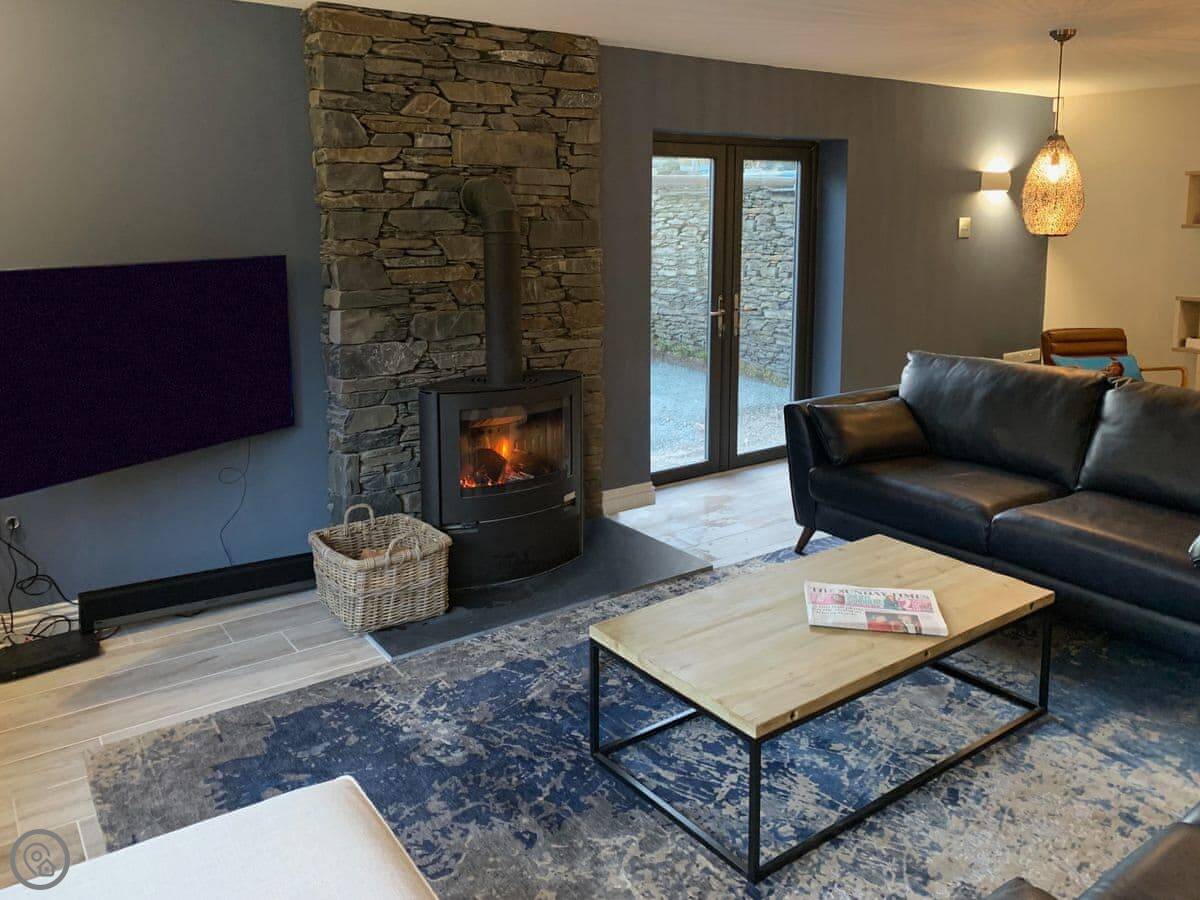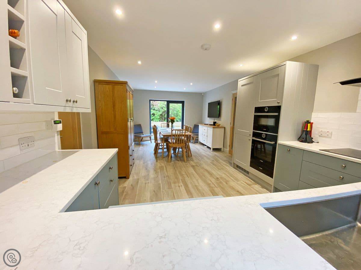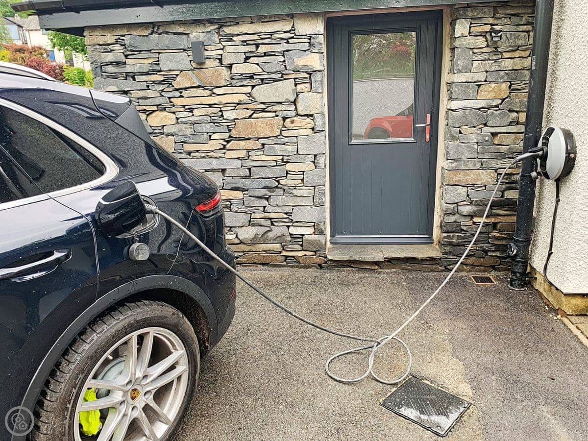 The living room is a good size, with a wood burner. The kitchen is open-plan. Both have doors out to the patio. There's parking on the drive and an electric vehicle charger.