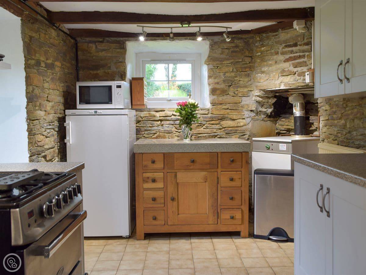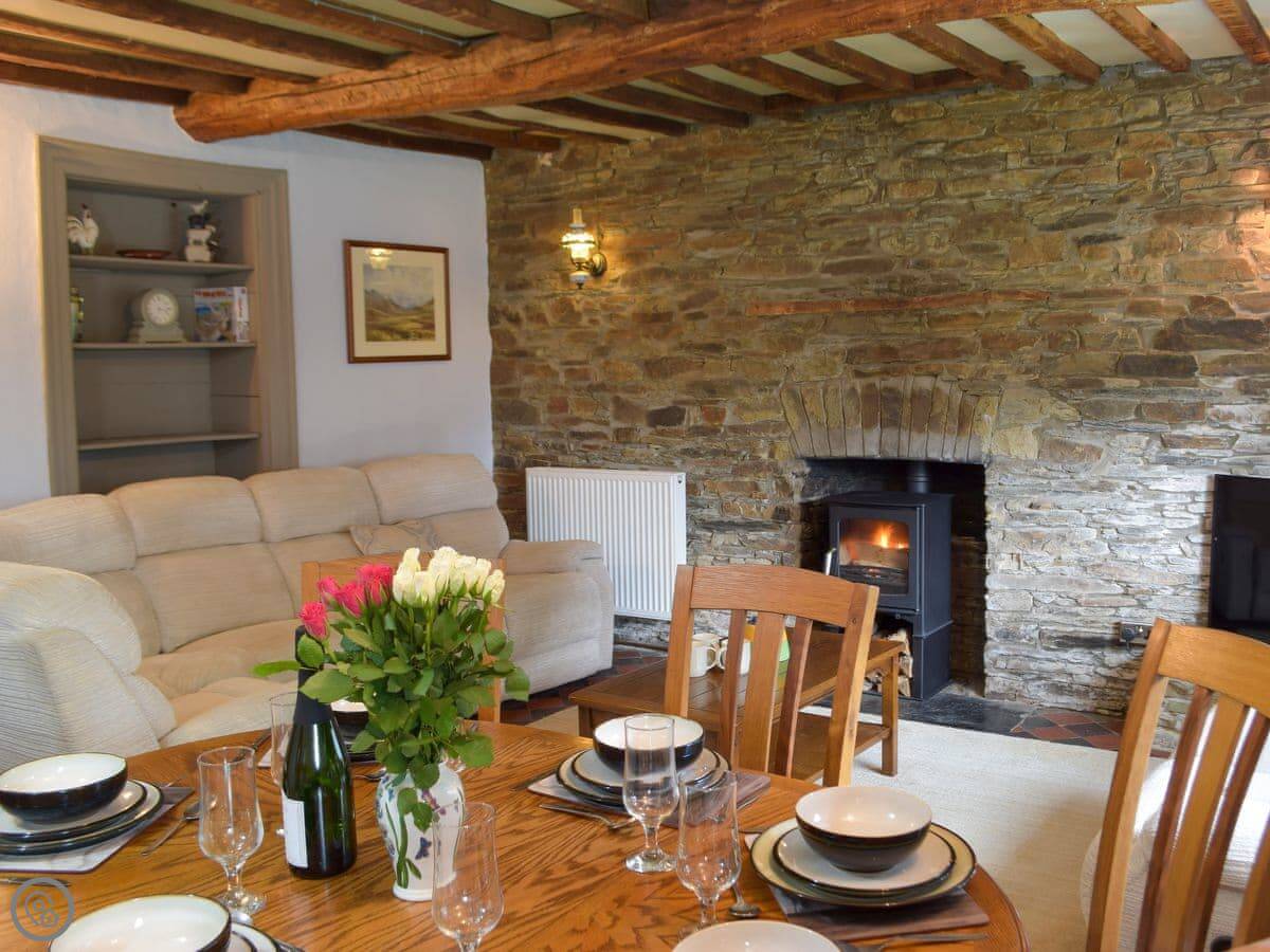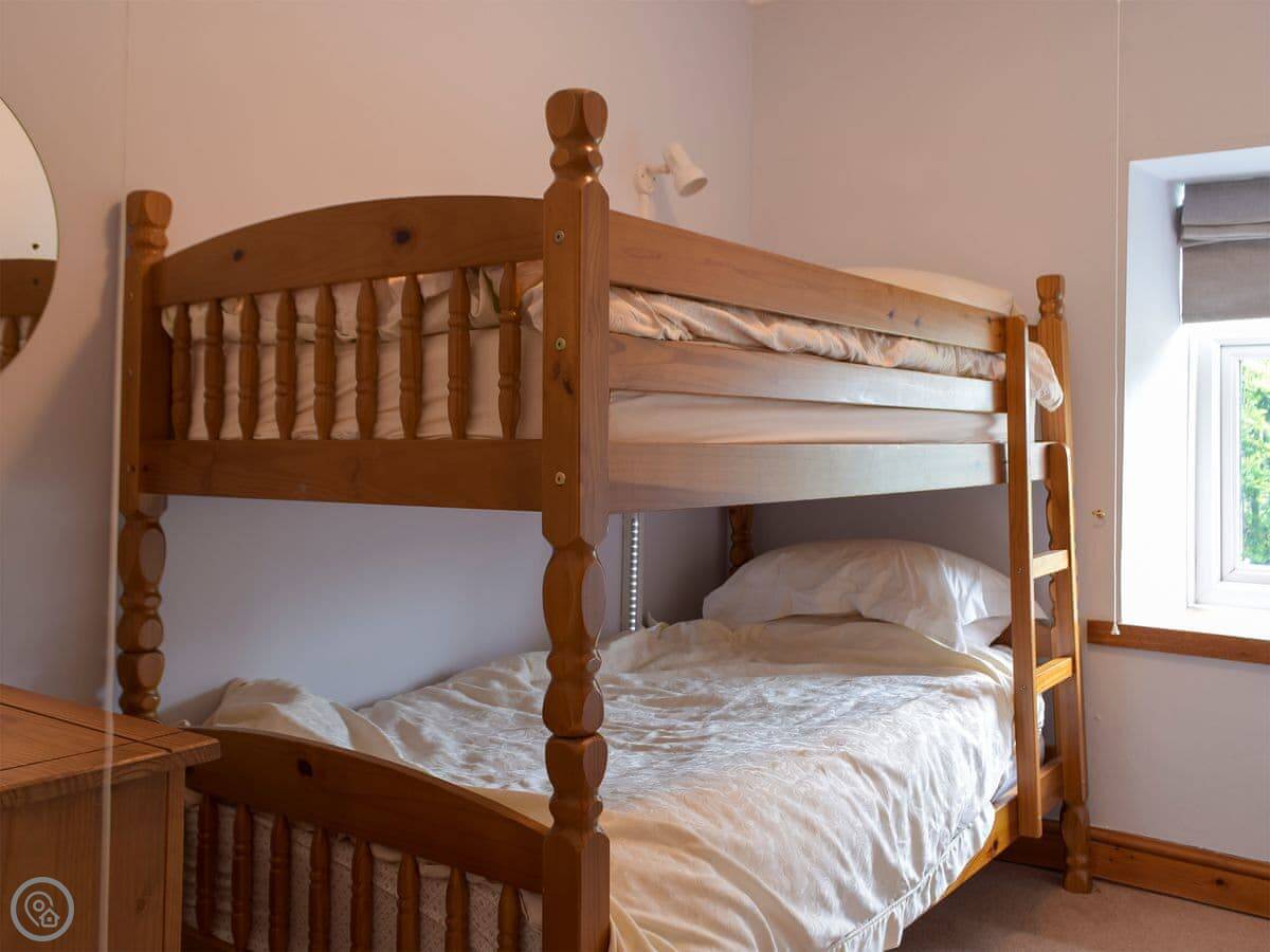 It sleeps four. Three bedrooms, one bathroom. It's got a 4 Star rating. It used to be the main farmhouse, so it's got some old features like beams and quarry tiles. The stairs are normal.