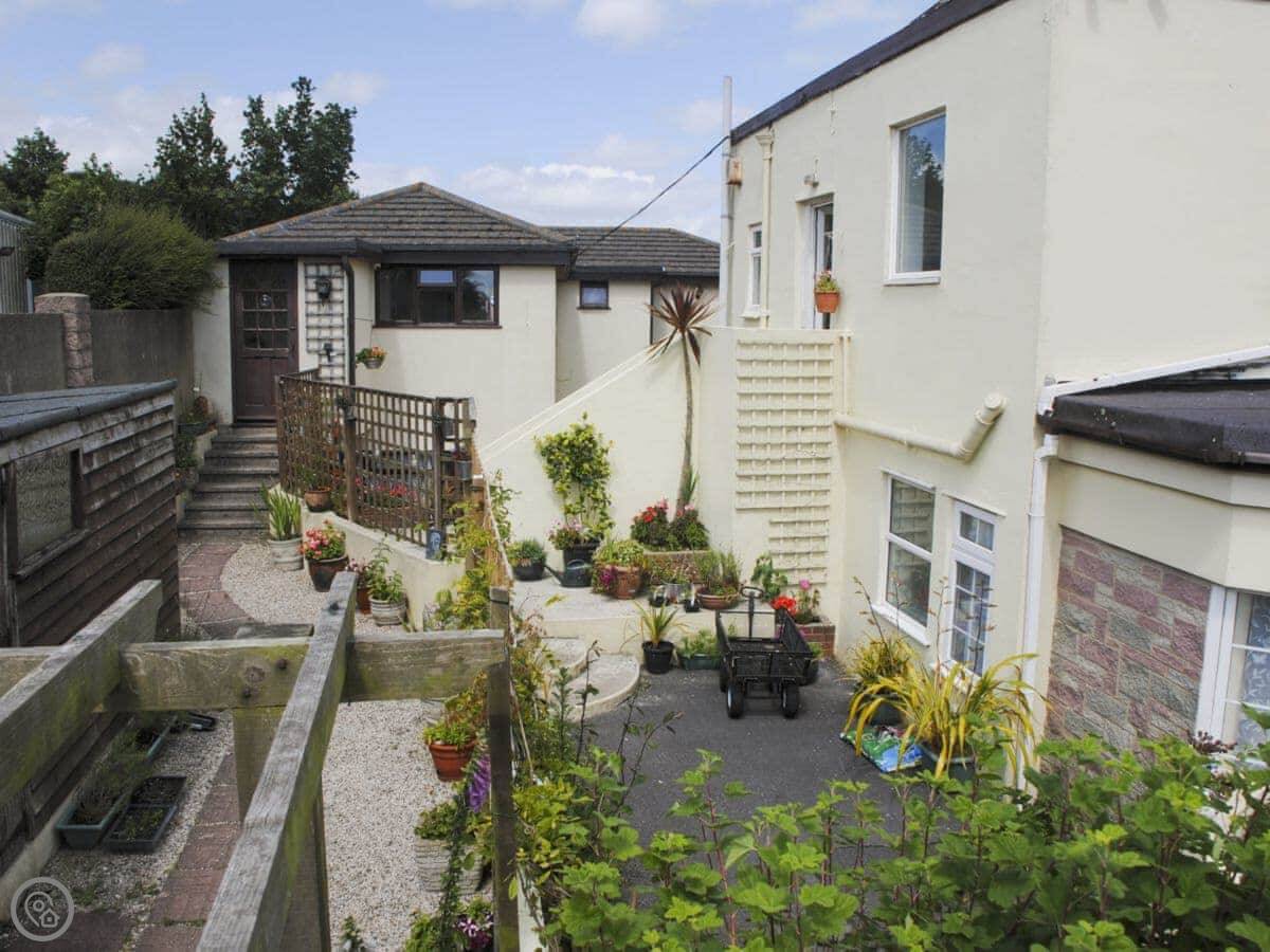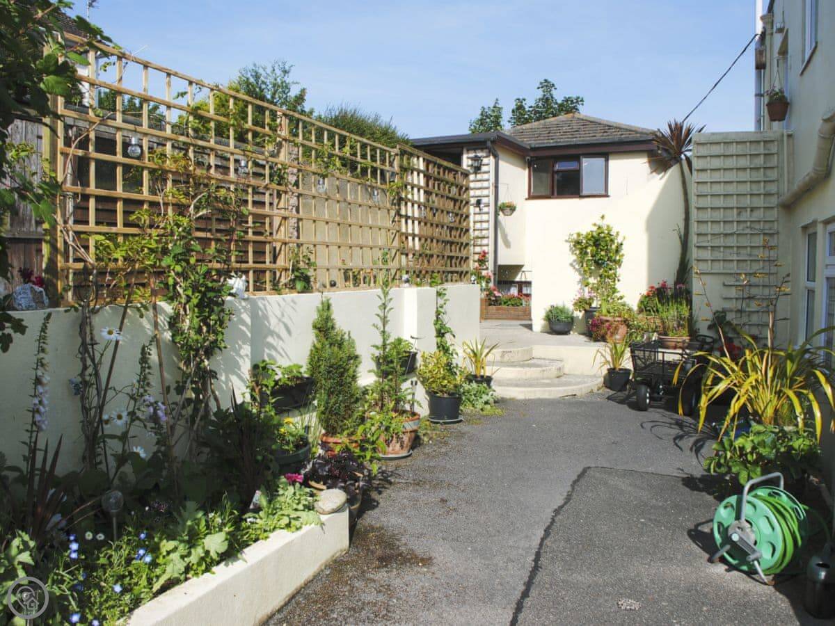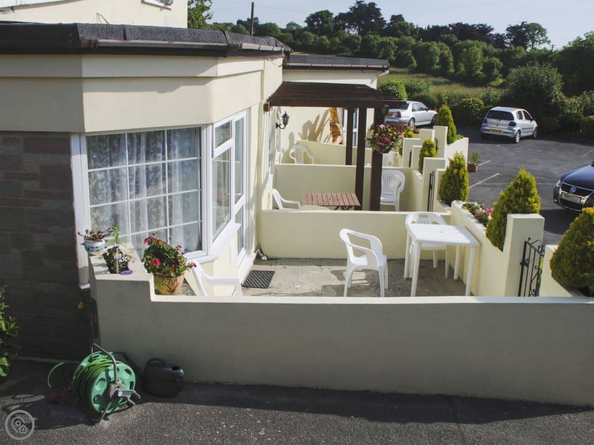 The patio area is yours to use. There's on-site parking. It's a terraced block of a few holiday apartments, but you have your own front door.