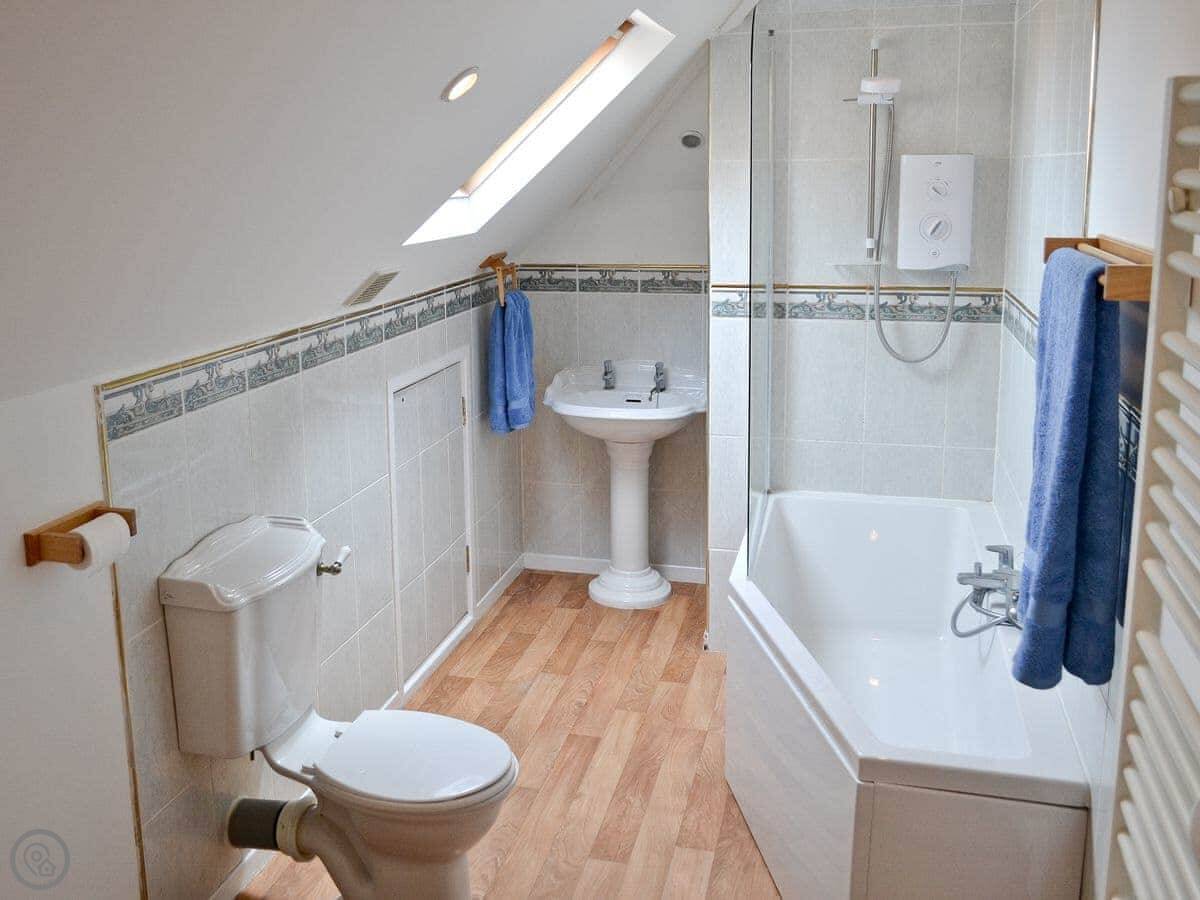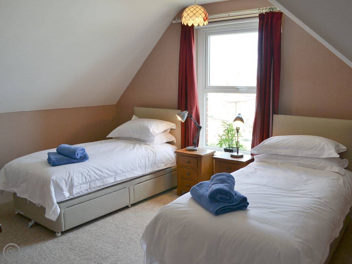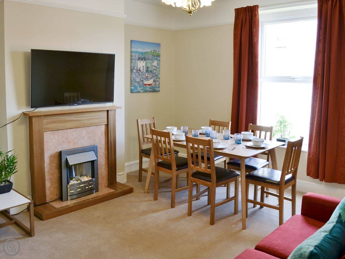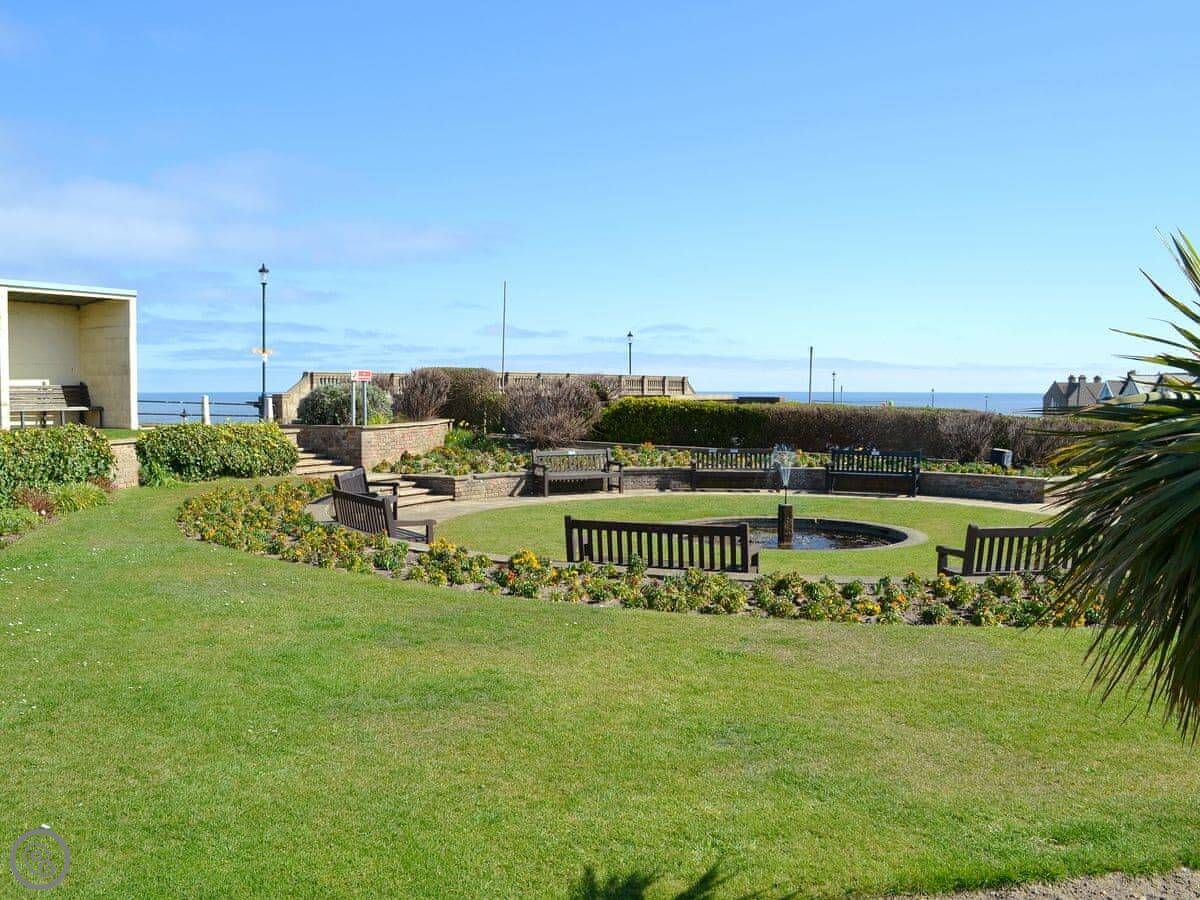 You're on the edge of the town centre here. There's a small shop, a pub, and a cafe practically next door. For the beach, you just turn left and walk down the hill. It's sandy and good for kids. The swimming pool and the golf course are both up on the cliffs.