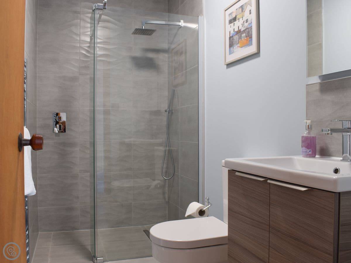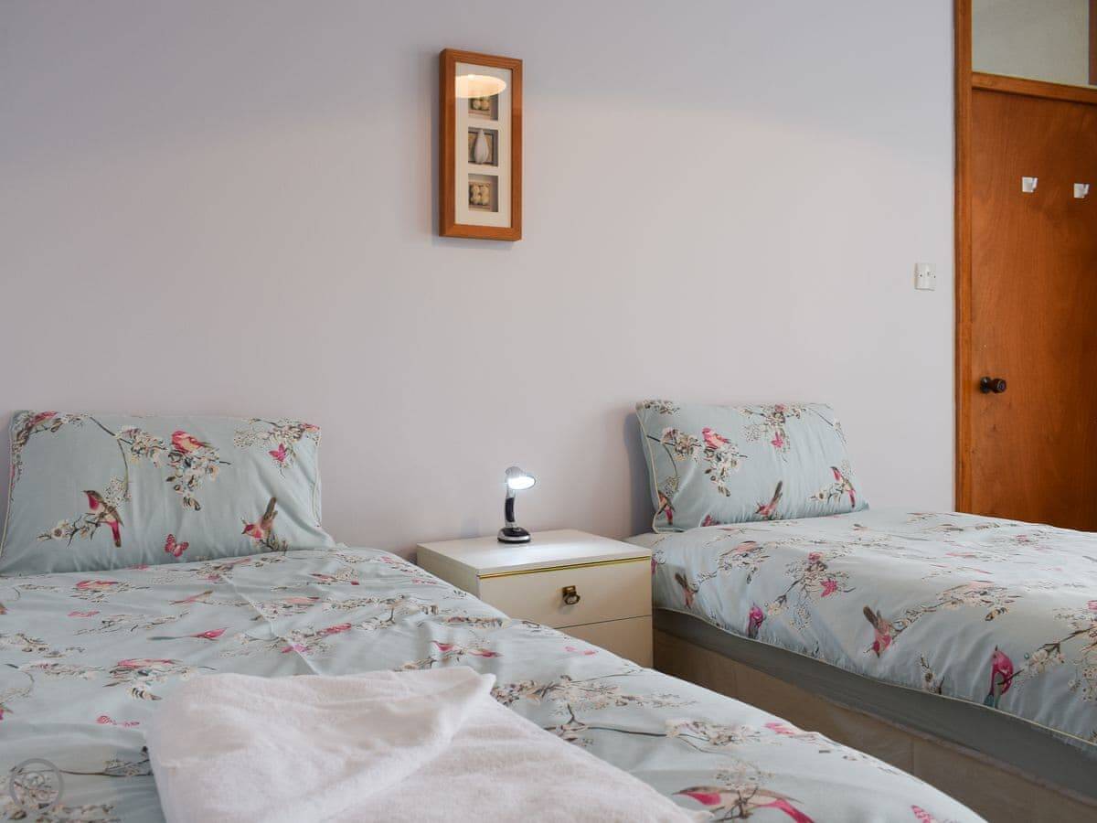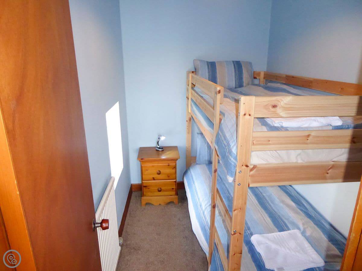 There are three bedrooms and two bathrooms. The layout is a bit unusual. One of the twin bedrooms leads through to a bunk room. It works for a family, but it's not completely private. The stairs inside are normal.