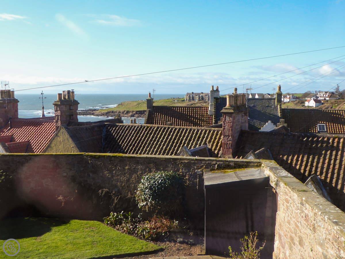 The main thing is the view. From the living room and one bedroom upstairs, you look out over the village roofs to the sea. It's a good view. There's a balcony up there with a table and chairs. Downstairs, there's a lawned garden as well.