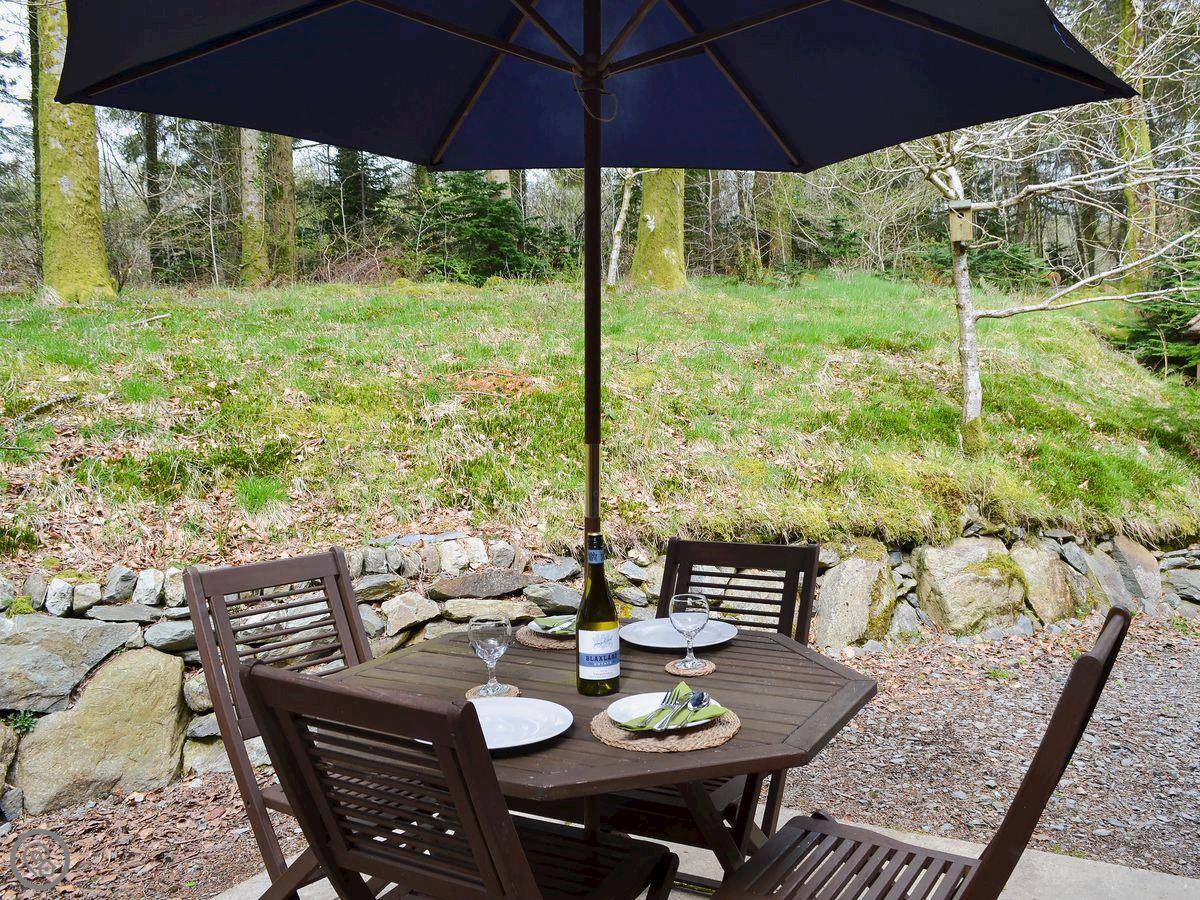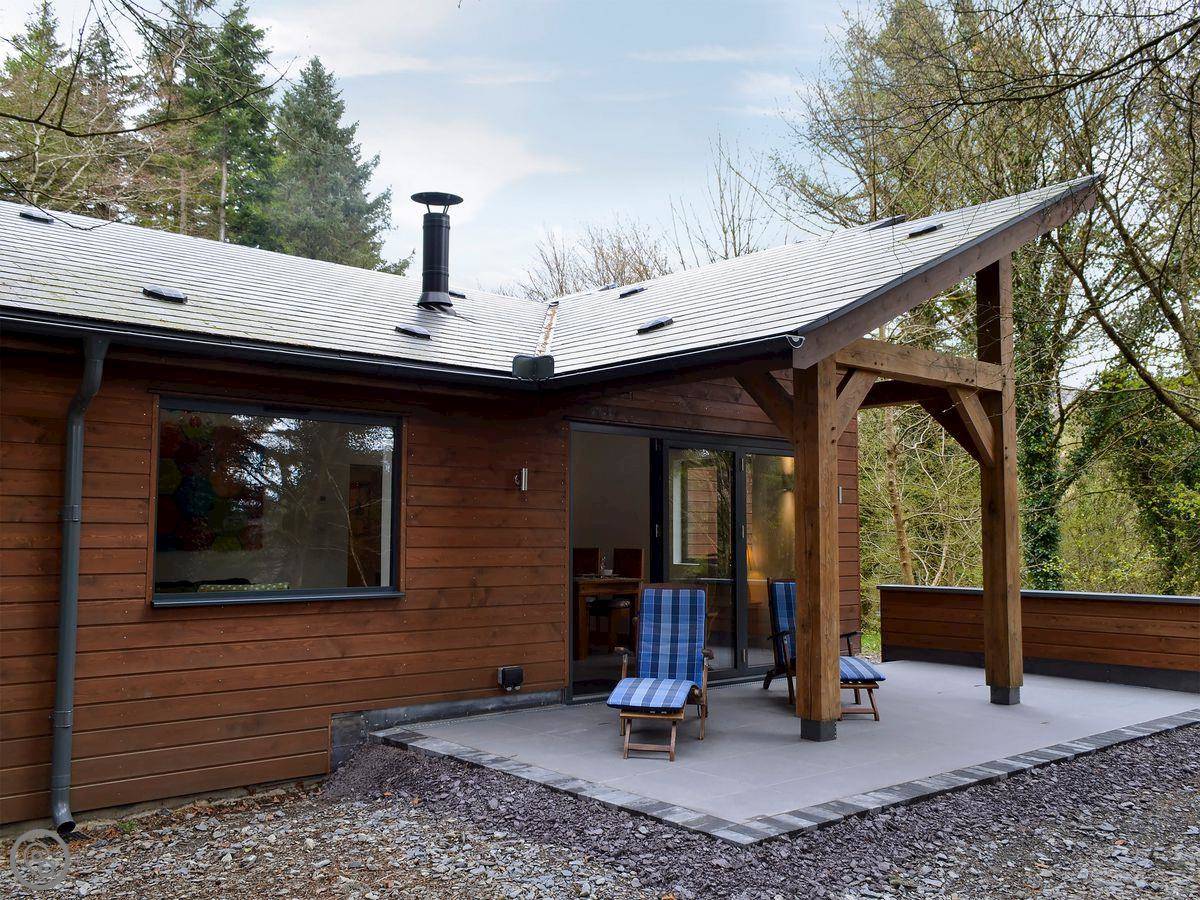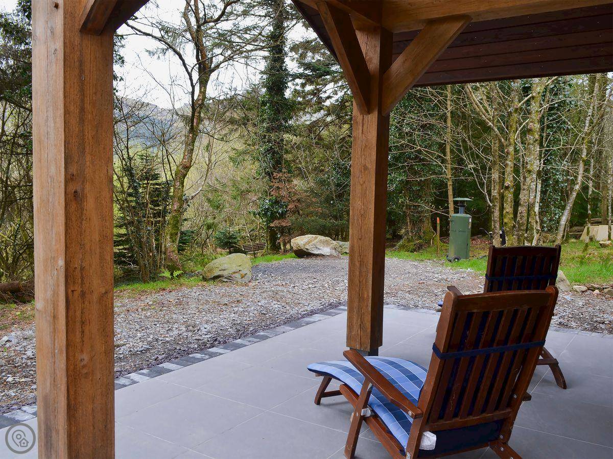 You get a big covered terrace out the front. It looks straight out at the trees and Moel Hebog mountain. Because it's covered, you can sit out there even if it's raining. The forest comes right up to the garden.