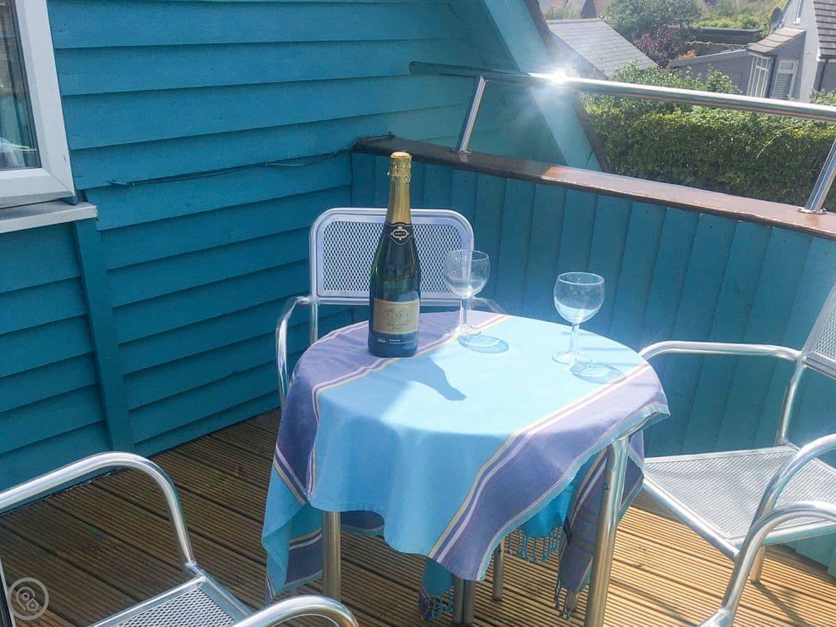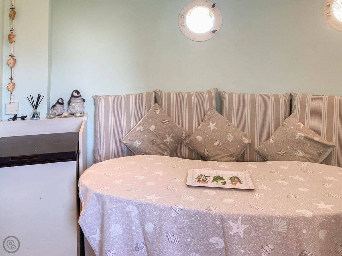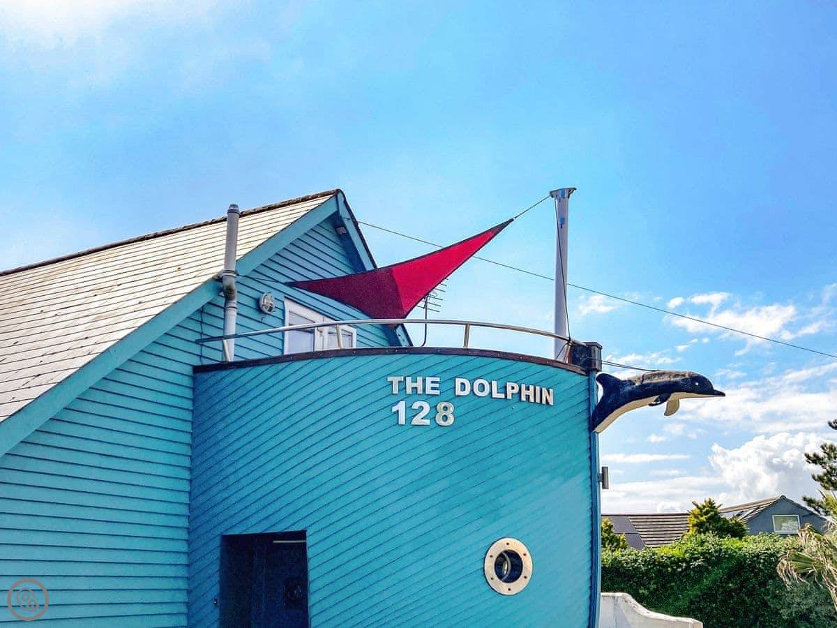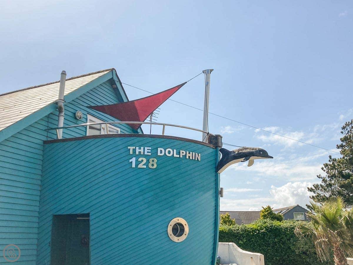 This place is called The Bow. It's in Middleton-on-Sea, just outside Bognor Regis. The owner lives next door and he built it to look like the front of a boat. It's a bit unusual inside. You'll see portholes, a curved wall, things like that. There's a balcony with boat railings.
