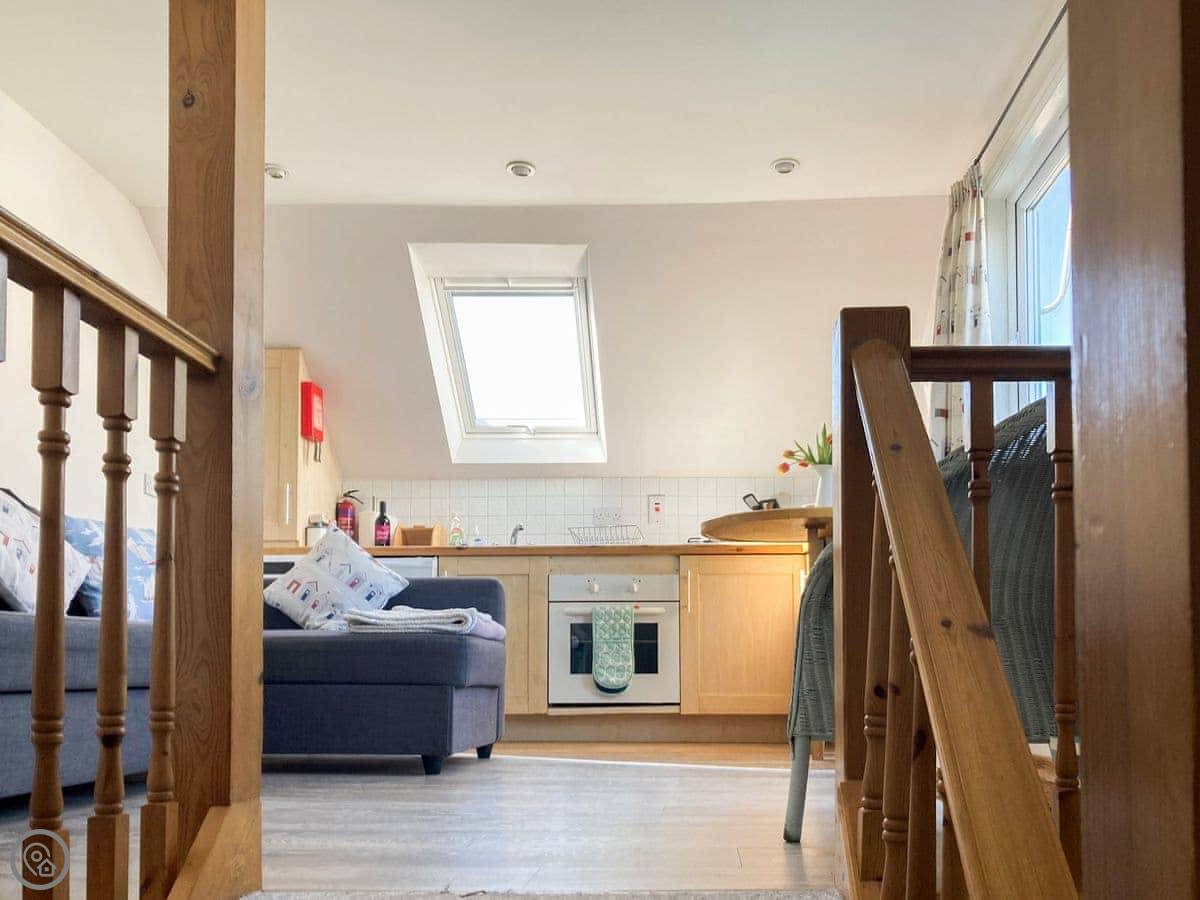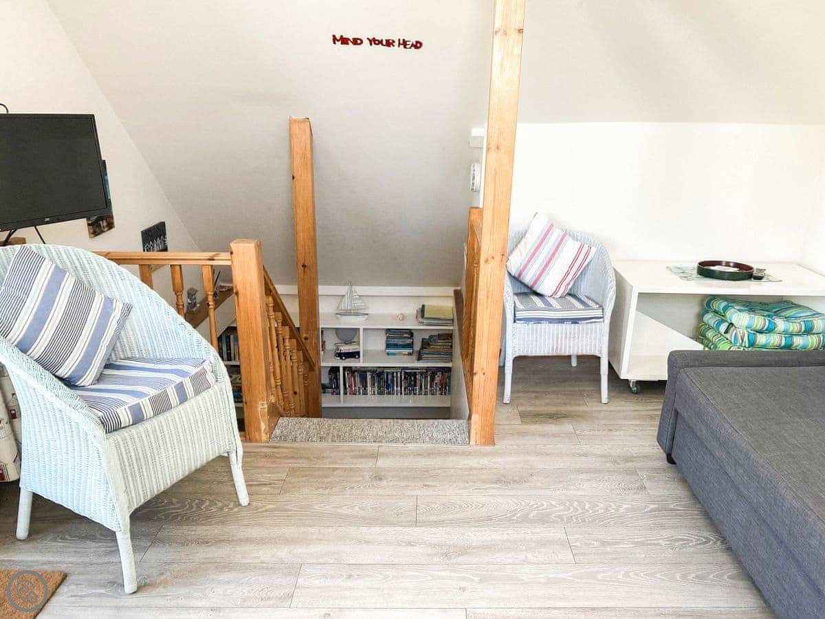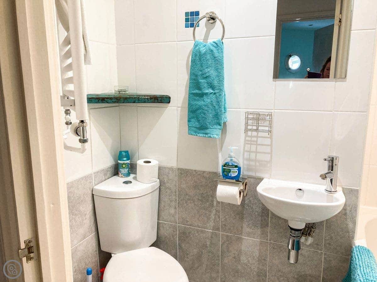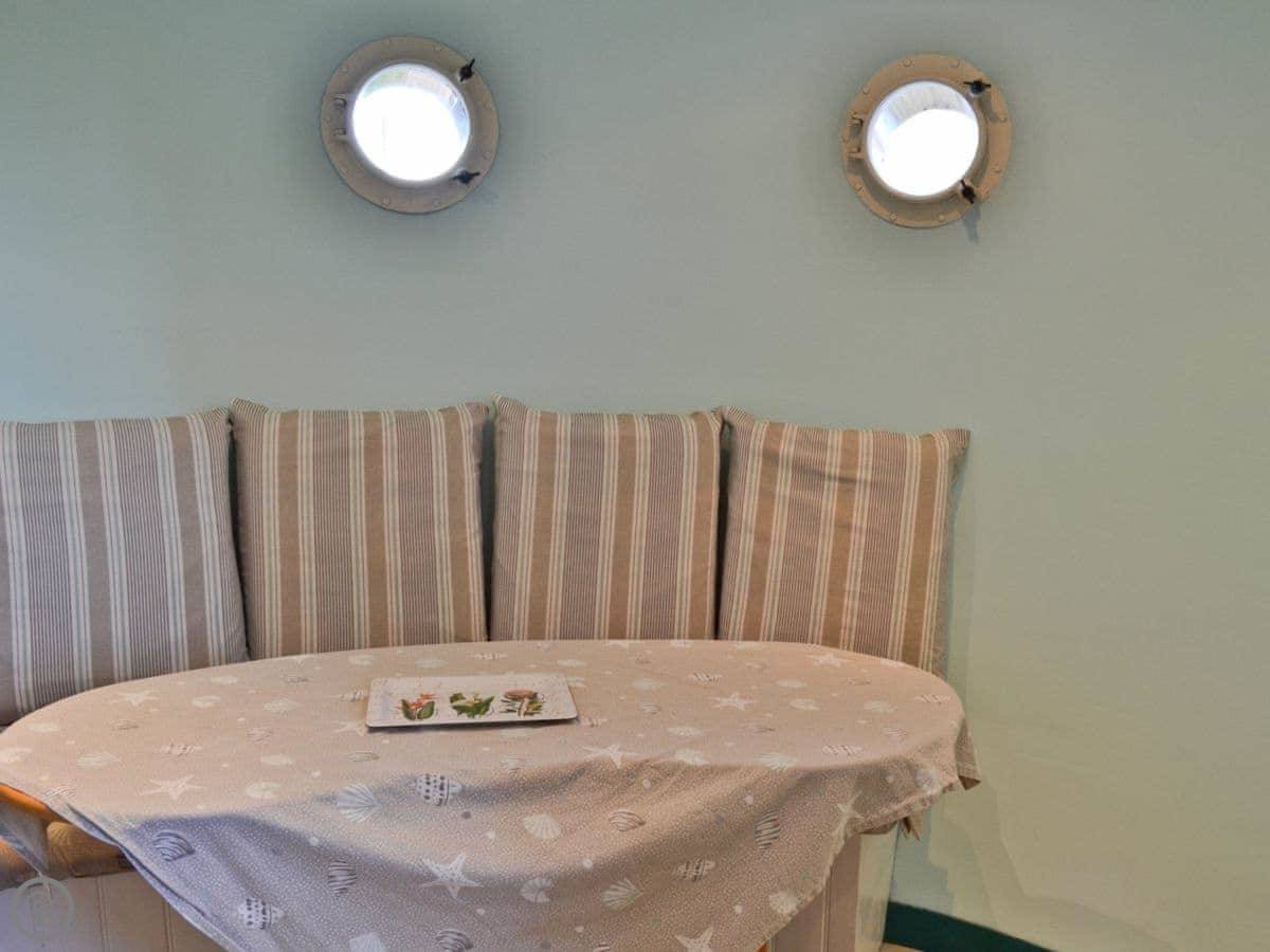 This place is called The Bow. It's in Middleton-on-Sea, just outside Bognor Regis. The owner lives next door and he built it to look like the front of a boat. It's a bit unusual inside. You'll see portholes, a curved wall, things like that. There's a balcony with boat railings.