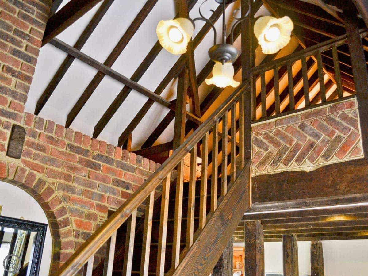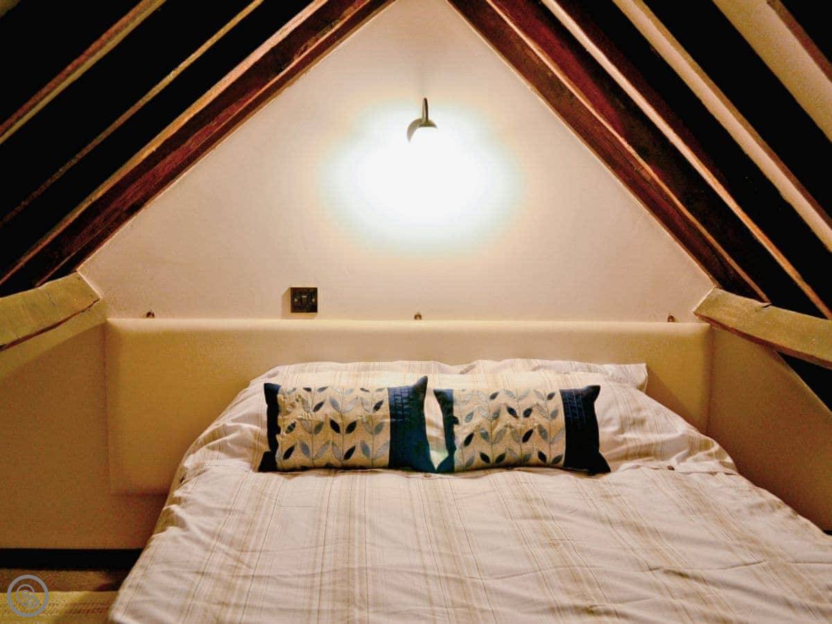 It sleeps two. One bedroom upstairs on a mezzanine floor, and one bathroom downstairs. It's got a 4 Star rating. Because it's a conversion, the ceilings downstairs are low in places, and the stairs up to the mezzanine are quite steep. If you're tall, you'll need to mind your head.