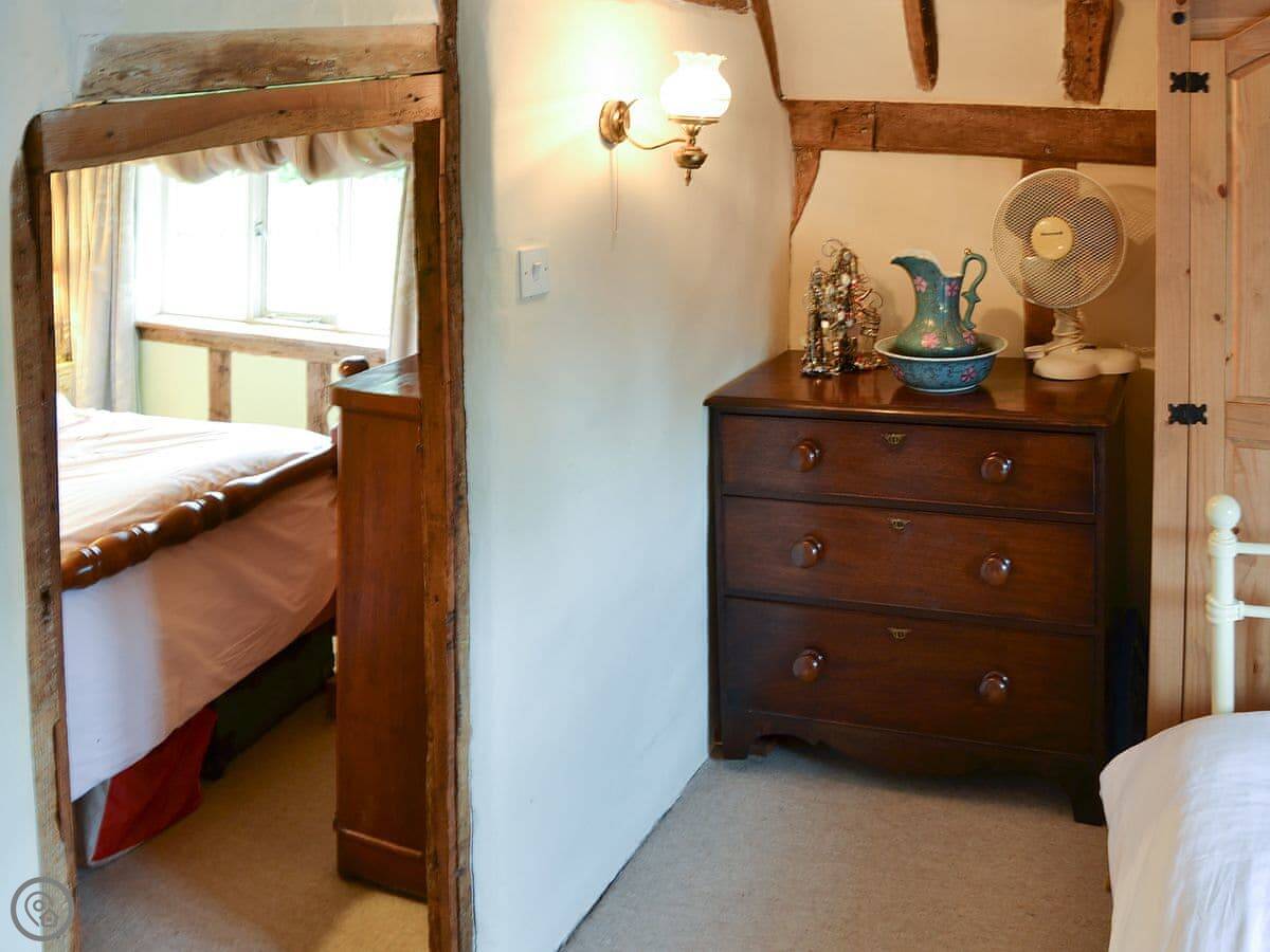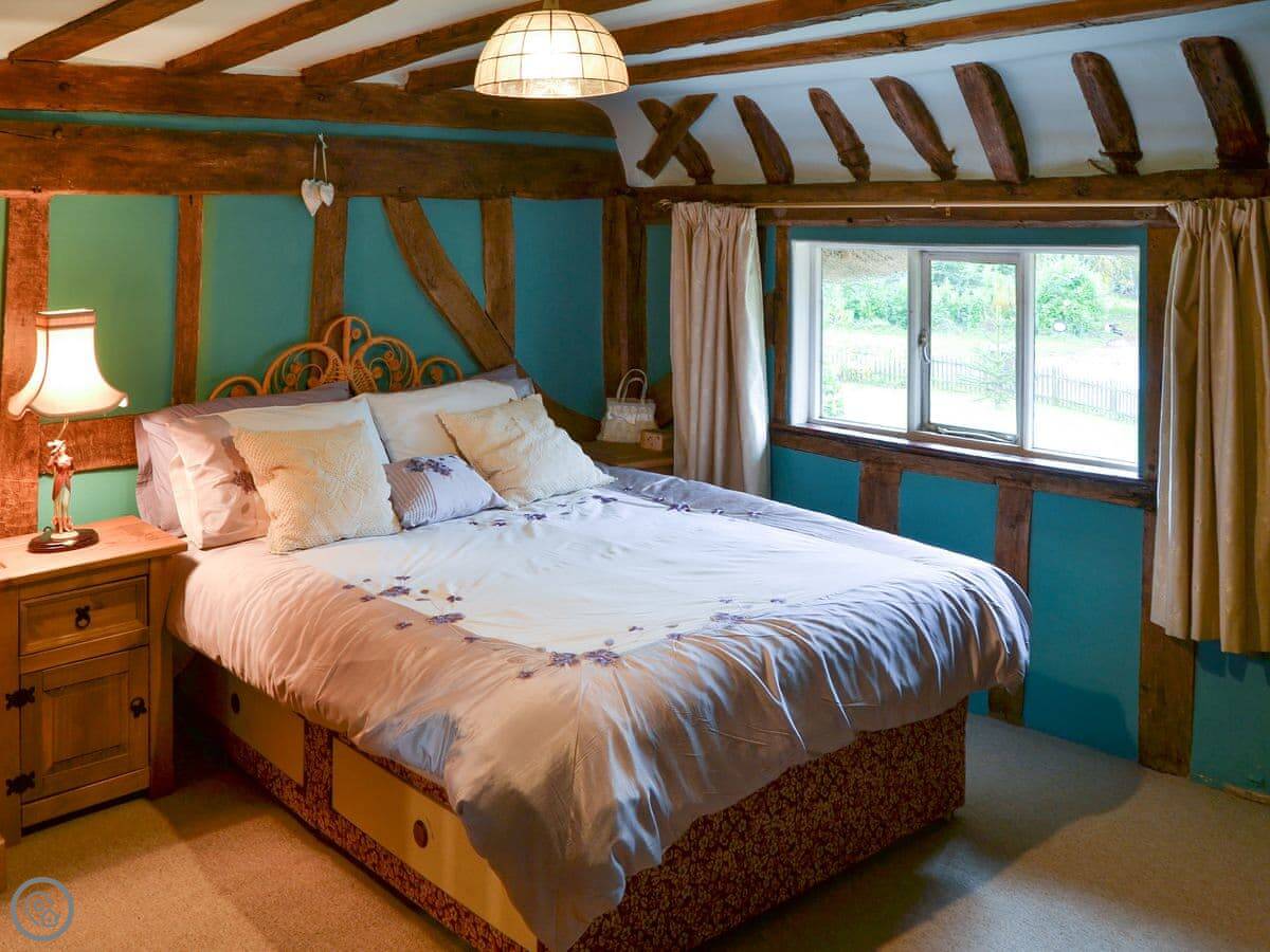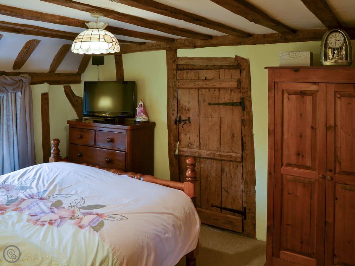 It sleeps five, in three bedrooms. There's one bathroom. The rating is 4 Star. You can tell the place is old, there are a lot of beams. The main fireplace is large.