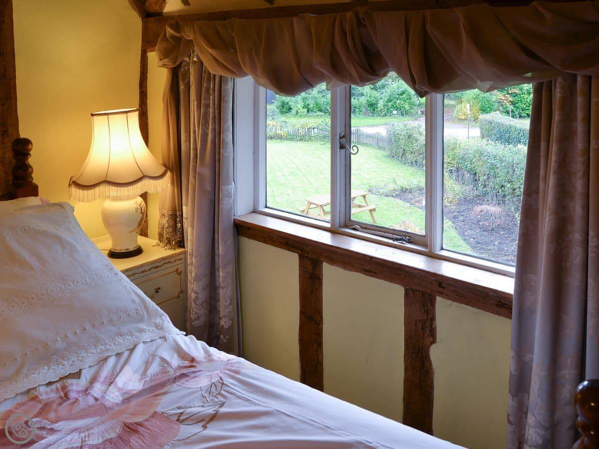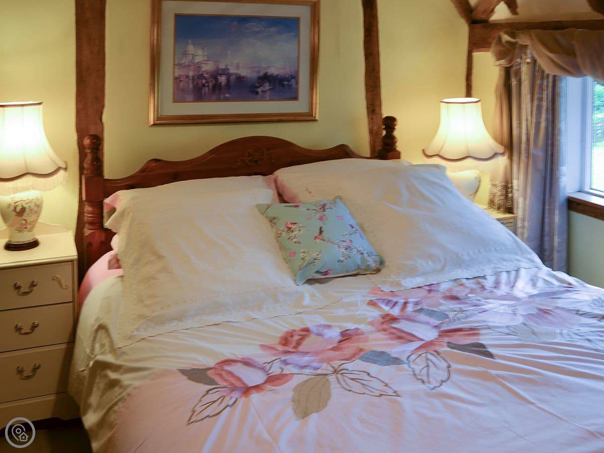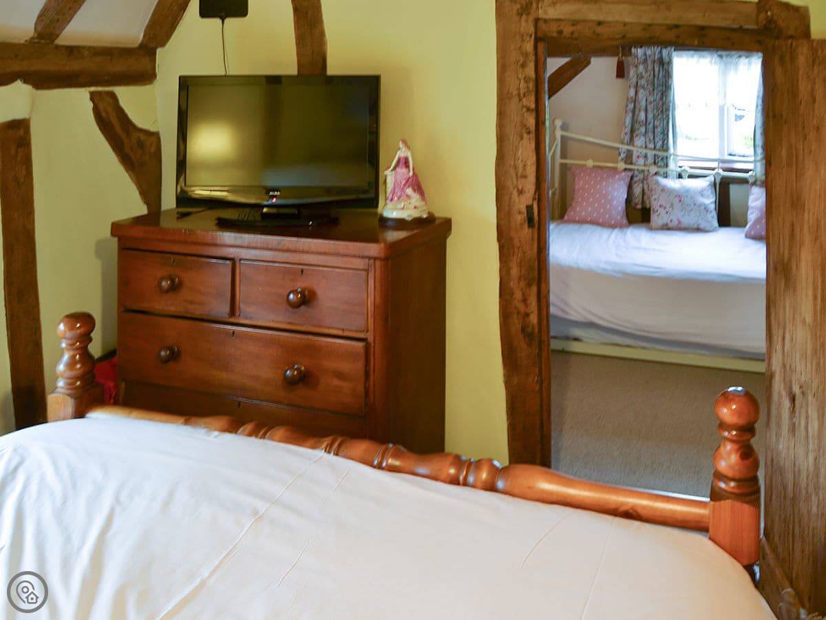 It sleeps five, in three bedrooms. There's one bathroom. The rating is 4 Star. You can tell the place is old, there are a lot of beams. The main fireplace is large.