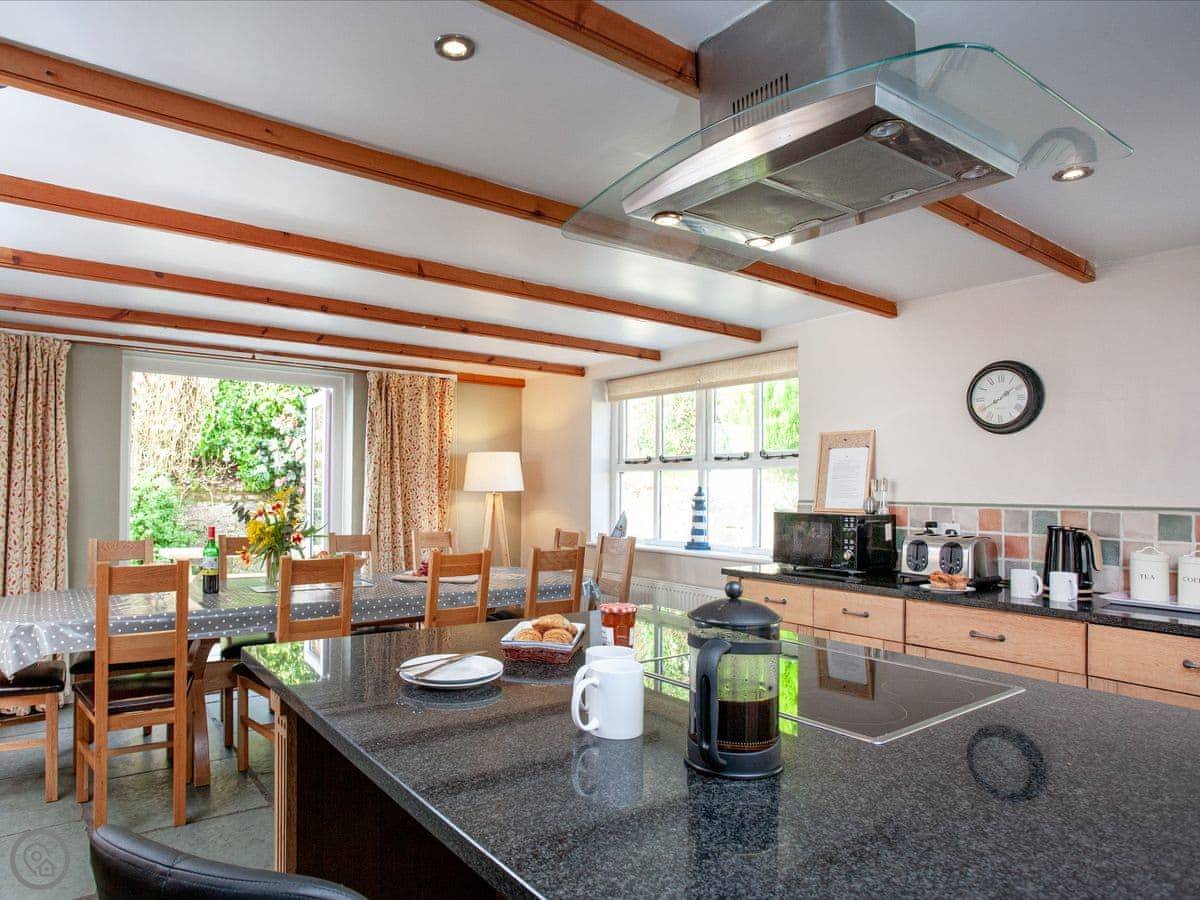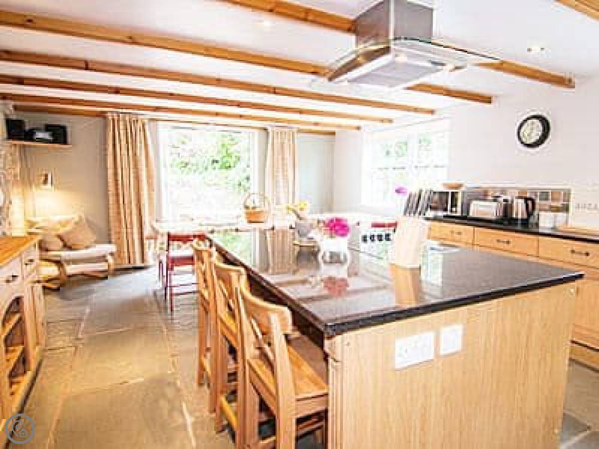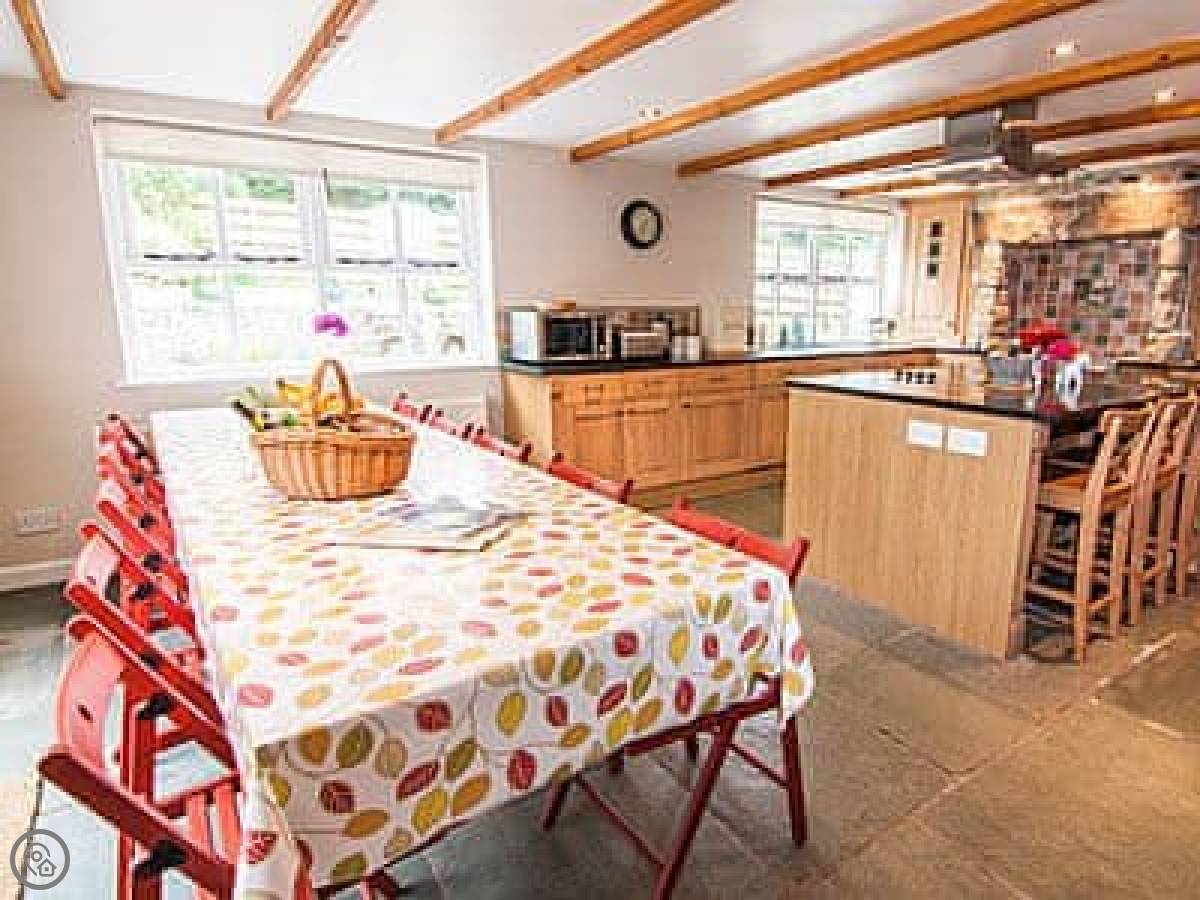 It sleeps twelve. Six bedrooms, four bathrooms. It's got a 4 Star rating, which means it's well-equipped and comfortable. It's a farmhouse, so the rooms are a decent size and it feels solid. There's a big dining table that's good for family meals.