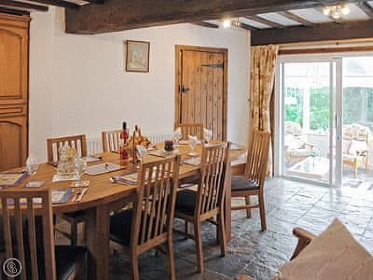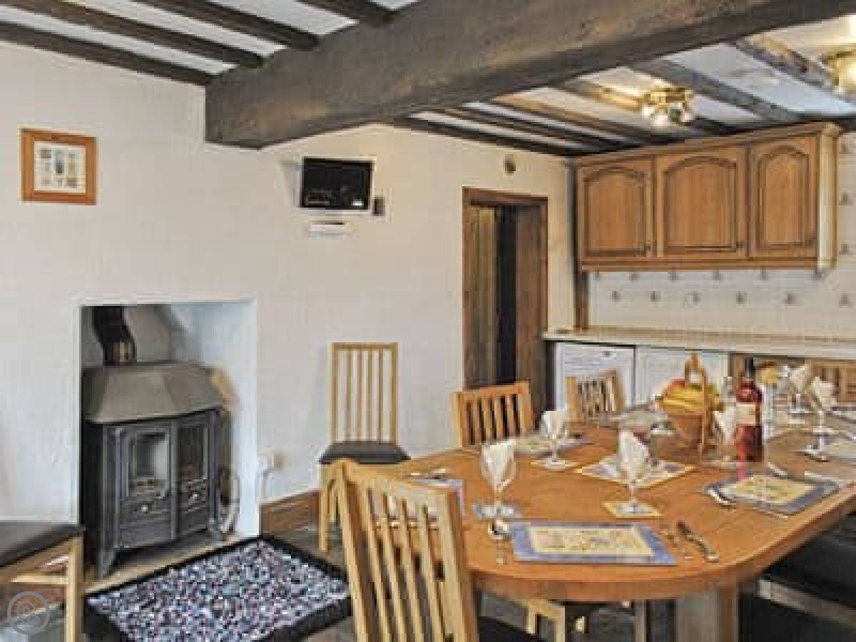 The kitchen is a proper farmhouse kitchen, big and with a lot of beams. There's a woodburning stove for cooler evenings. The garden is enclosed. There's a patio with table and chairs that looks over it.