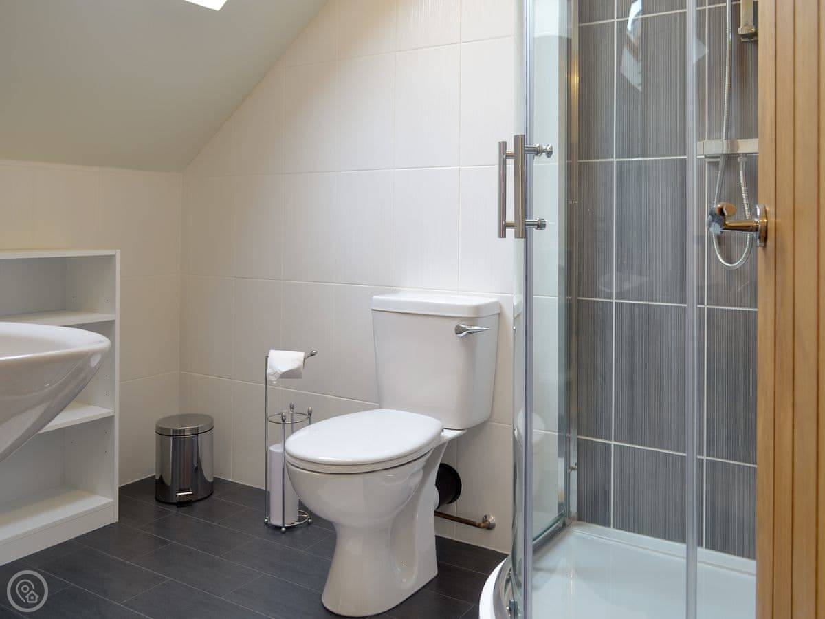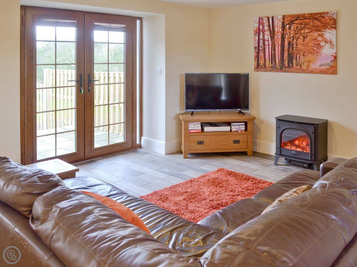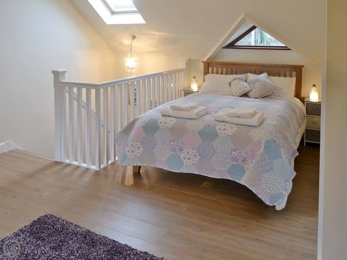 From here, you look out over fields and trees. Being a converted farm building, the ceilings are high. The stairs going up to the bedroom are quite steep.