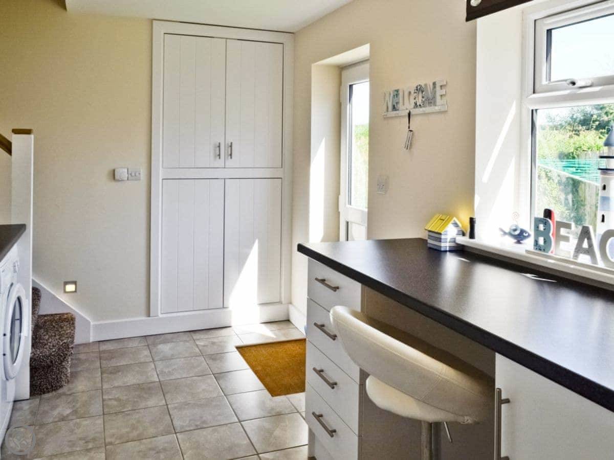 Inside, it's open plan downstairs. There's a washing machine, dishwasher, TV and WiFi. We provide all the bedding and towels. There's a cot and a highchair if you need them, and a stairgate at the bottom of the stairs. The stairs are fine, just a normal flight.