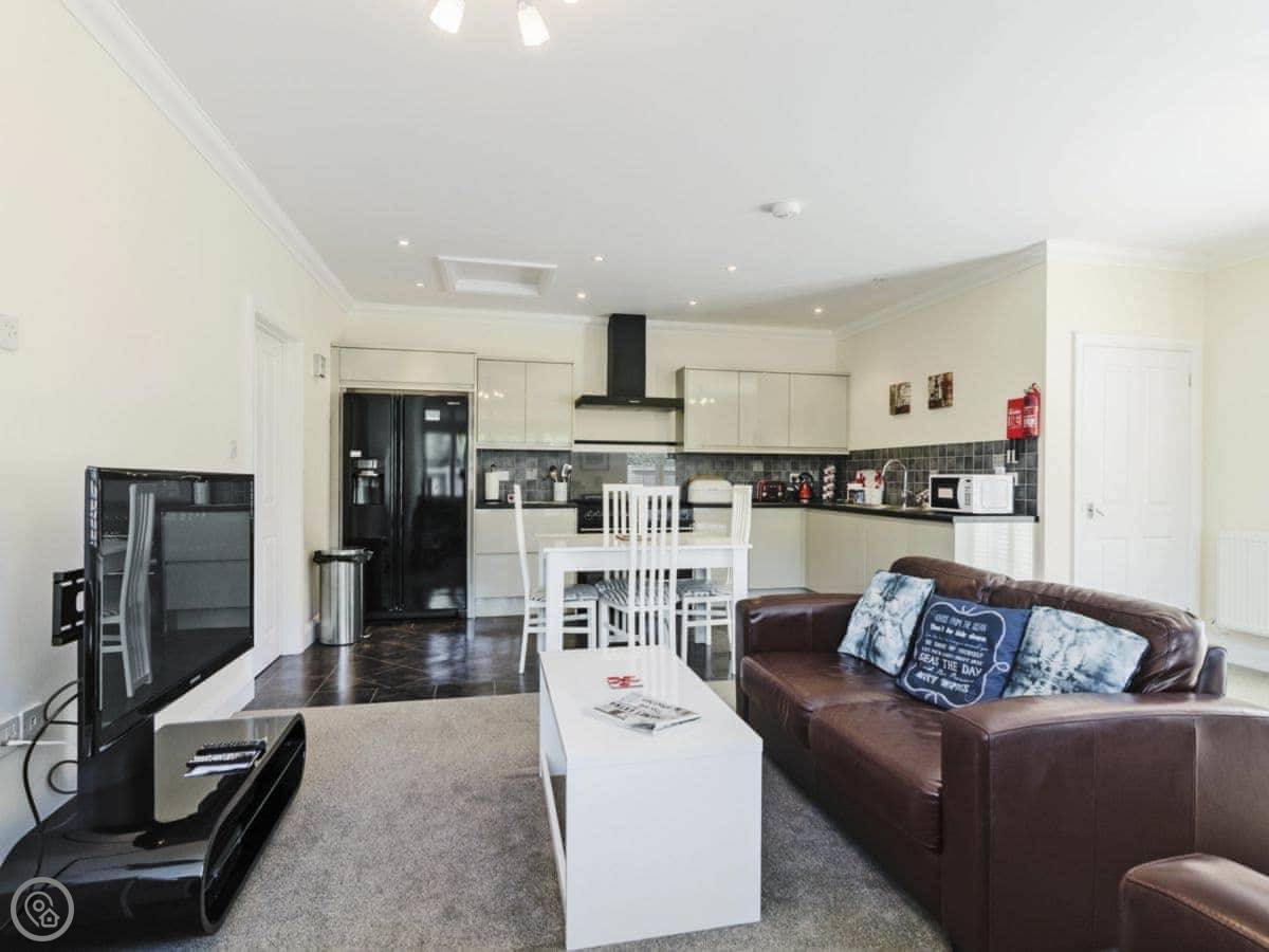 It's open plan inside. There's a dishwasher and a washing machine. Bedding and towels are included. Parking is right there.