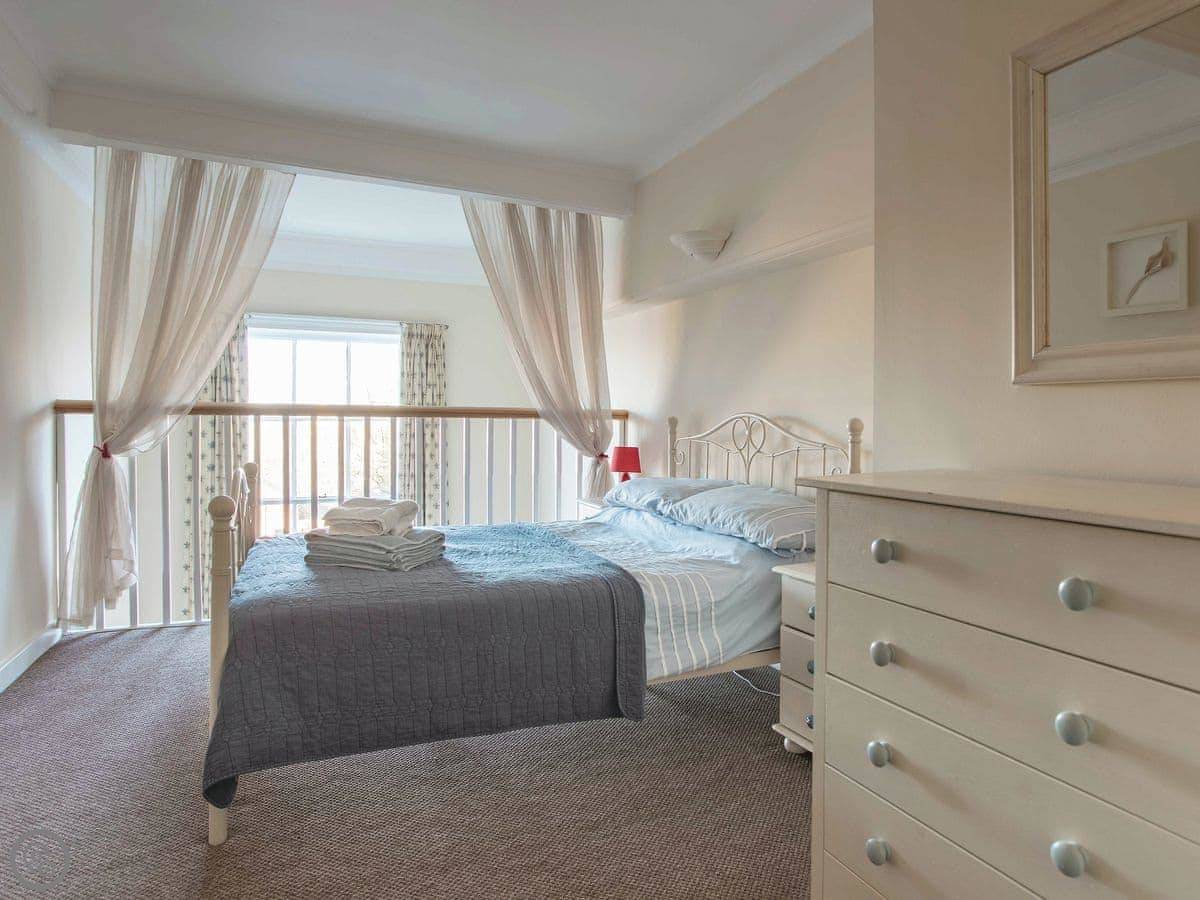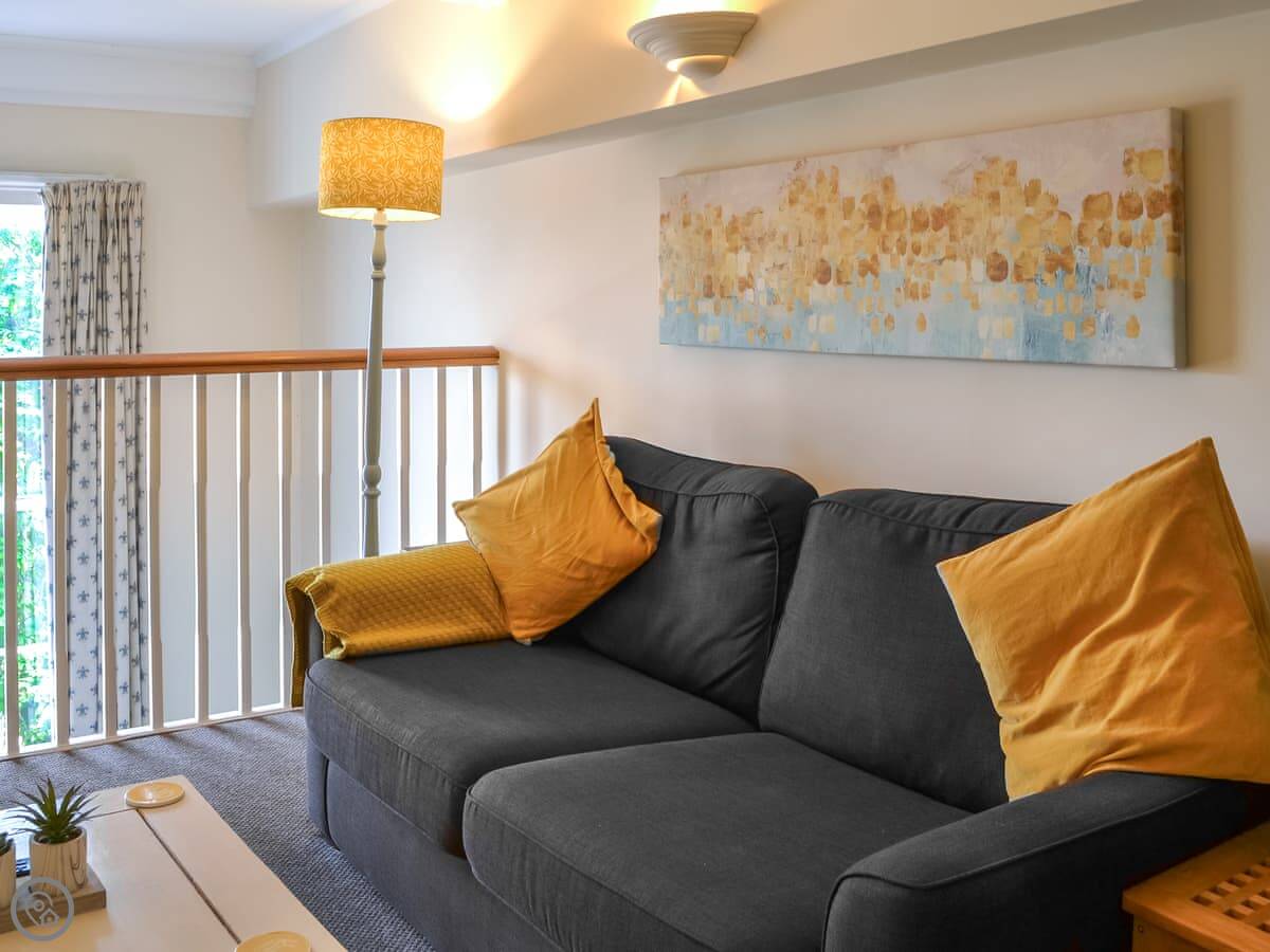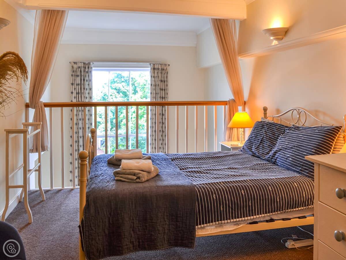 It sleeps four. Two bedrooms, one bathroom. It’s got a 4 Star rating. It’s spacious and has big windows, so it’s light. One of the bedrooms is on a mezzanine level above the living area, with a balcony looking down. The other bedroom and a second living space are up another flight of stairs. The stairs inside are a fairly standard spiral type.