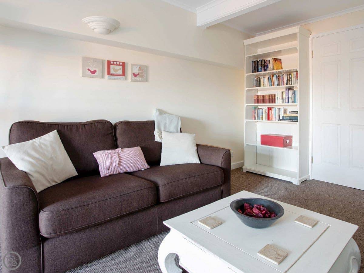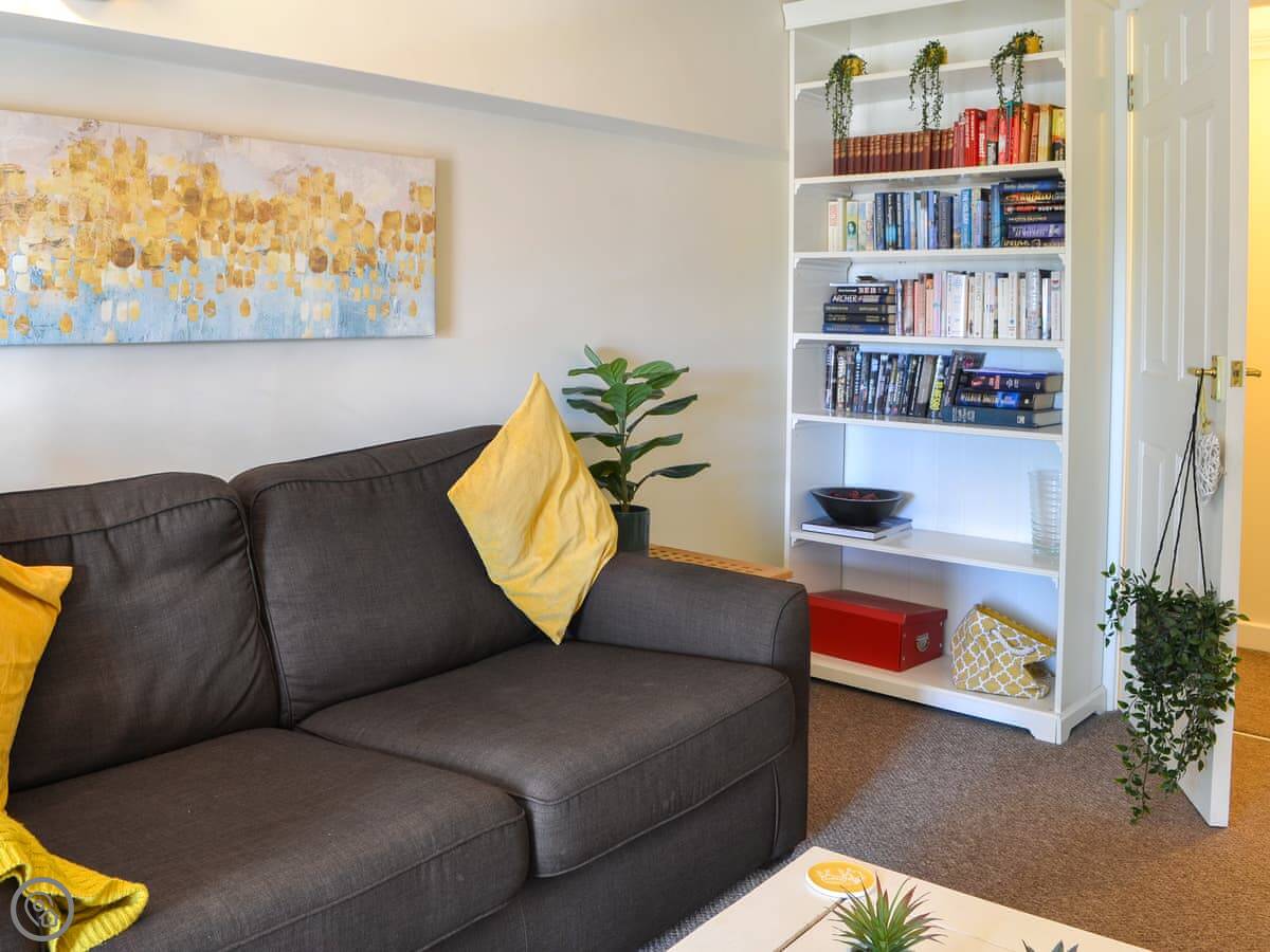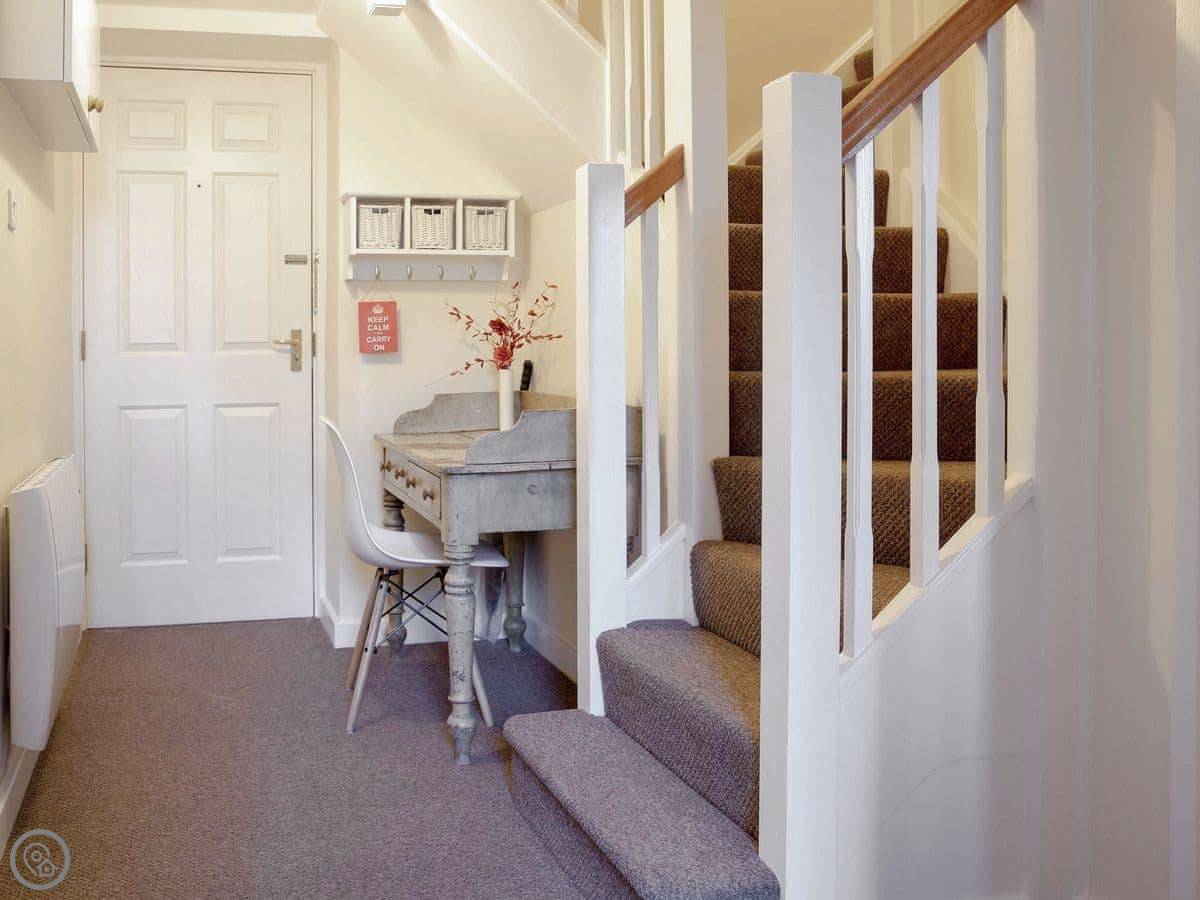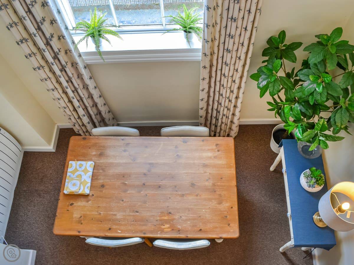 It sleeps four. Two bedrooms, one bathroom. It’s got a 4 Star rating. It’s spacious and has big windows, so it’s light. One of the bedrooms is on a mezzanine level above the living area, with a balcony looking down. The other bedroom and a second living space are up another flight of stairs. The stairs inside are a fairly standard spiral type.