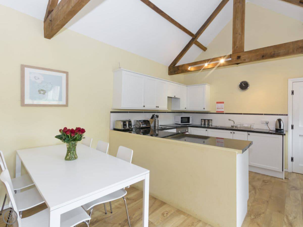 The barn sleeps six. Three bedrooms, two bathrooms. It's got a 4 Star rating. It feels spacious inside, with wooden floors and a wood burning stove. The windows have good views over the fields.