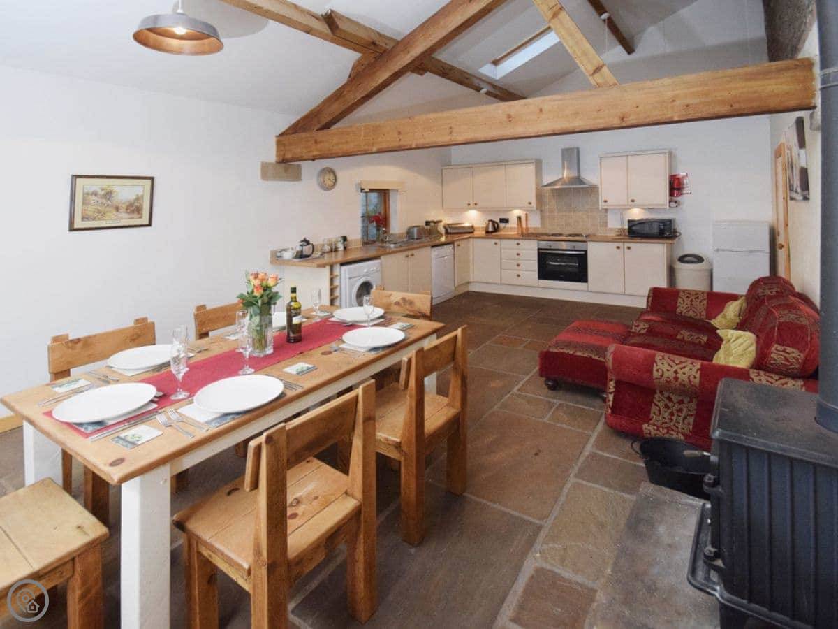 Inside, there's a woodburning stove for cooler evenings. It’s got a dishwasher, washing machine, TV, and Wi-Fi. Bedding and towels are included. We can provide a cot and a highchair if you need them.