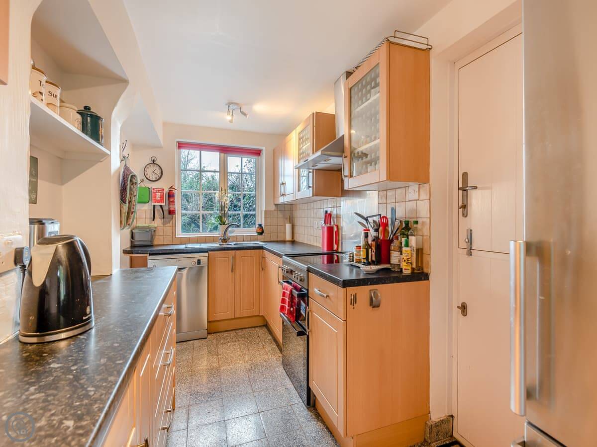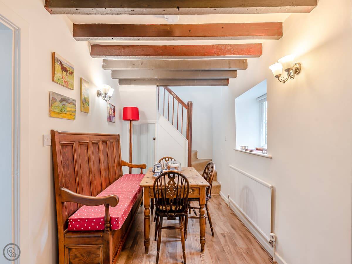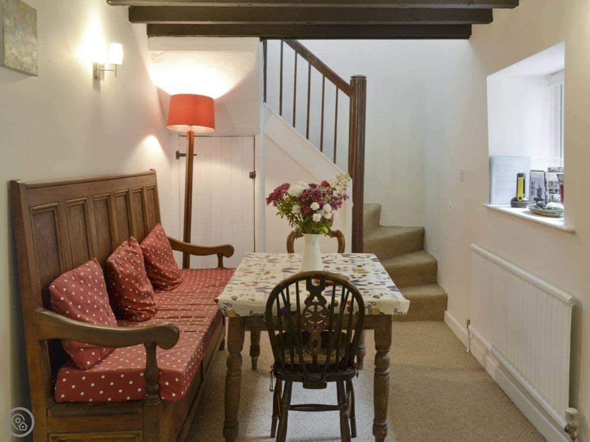 Because it's built onto the rock, the floor levels are a bit unusual. There's a step up into the kitchen from the living room. The stairs are the original ones, so they're narrow and a bit twisty. They're not great for anyone with mobility issues. It's not wheelchair accessible.