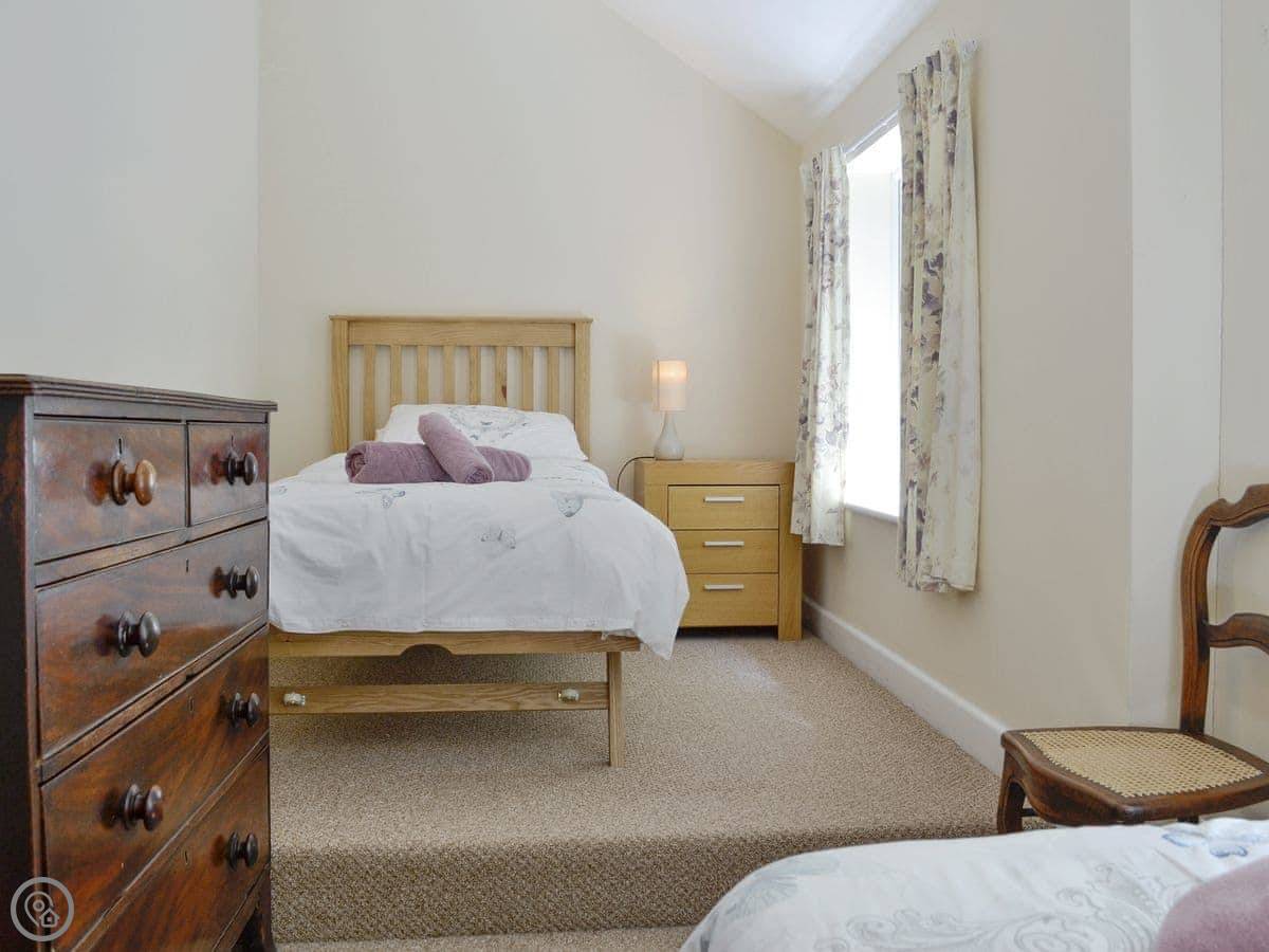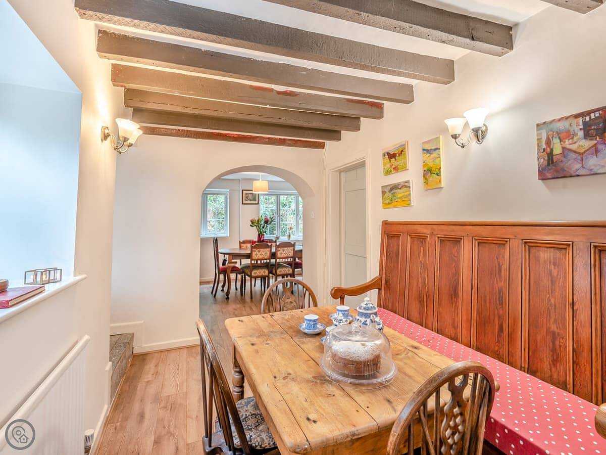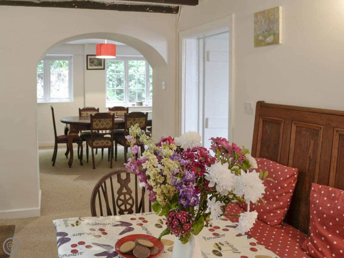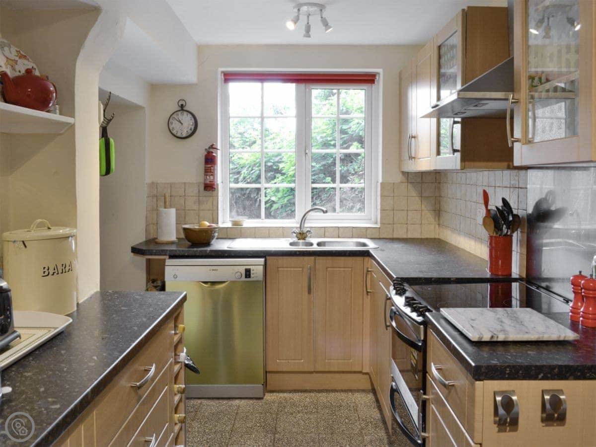 Because it's built onto the rock, the floor levels are a bit unusual. There's a step up into the kitchen from the living room. The stairs are the original ones, so they're narrow and a bit twisty. They're not great for anyone with mobility issues. It's not wheelchair accessible.